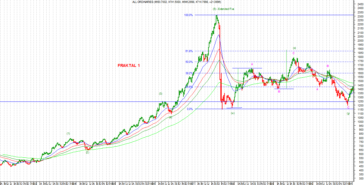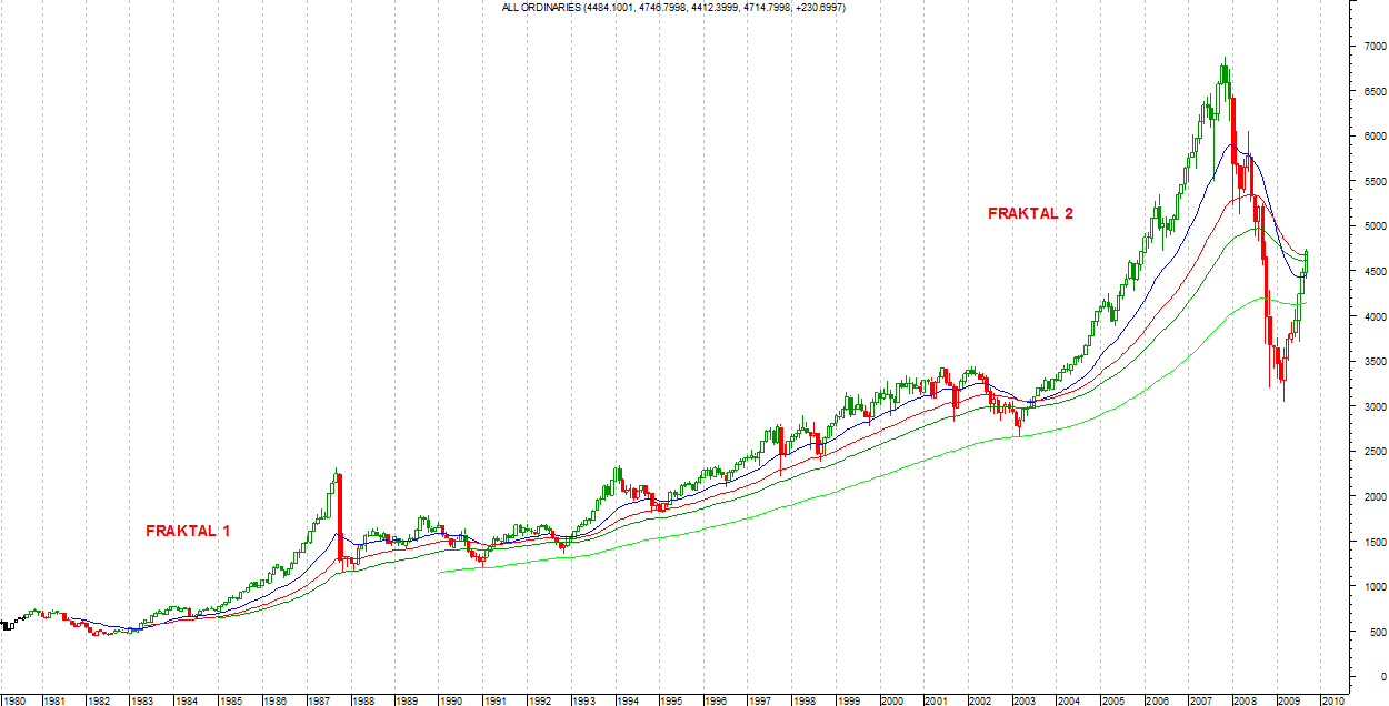 Do takich rynków należy z pewnością rynek akcji w Australii, gdzie indeks AS30, zwany zwyczajowo All Ordinarities, bardzo często kreśli struktury fraktalne. Być może powodem tego jest duże nasycenie spółkami wydobywczymi na tym rynku i jego korelacja z rynkiem surowców kopalnych. Powody są dla mnie mniej istotne, ważniejszym jest sam fakt i możliwość wykorzystania tego przy prognozowaniu przyszłych ruchów.