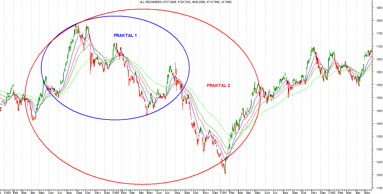 Popatrzmy na wykres pierwszy, gdzie mamy pokazany przykład podręcznikowego fraktala. Jak widzimy pierwszy z nich, mniejszy, był miniaturową kopią całego ruchu falowego z lat 89-91.