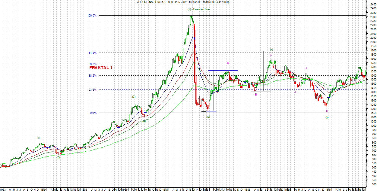 Jak widać na pierwszym fraktalu po załamaniu z 1987 roku rynek wyrysował korektę złożoną (w)(x)(y) by po roku 1991 rozpocząć kolejny cykl wzrostowy, zakończony w 2007 roku. Fala (w) zniosła podręcznikowo całą rozszerzoną falę piątą (5). Następnie wyrysowano trójfalową korektę tych spadków jako fala (x). Pierwszy jej segment – podfala A – doszła do poziomu nieco przekraczającego 38% zniesienia fali (w), by zawrócić do poziomu 23% zniesienia, a następnie wygenerować falę C, która nieco przekroczyła 50% zniesienia fali (w). Dopiero po tym cyklu została wygenerowana fala spadkowa (y) testująca dno wyznaczone falą (w) i po jego pozytywnym teście rozpoczął się nowy cykl wzrostowy.