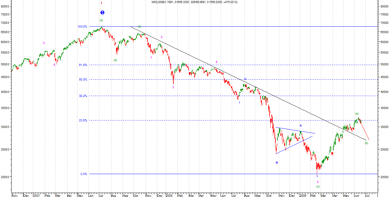 Na DAX formuje się najprawdopodobniej ED jako fala 5 Minor. Do klasycznego zakończania brakuje jeszcze jednej podfali z wyjściem ponad górne ograniczenie. Widziałem jednak niejednokrotnie skarłowaciałe fale piąte w klinach.