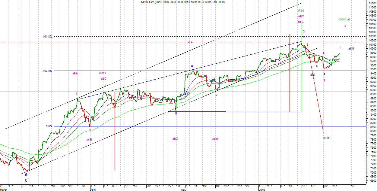 Na NIKKEI mamy wykończoną falę 4 Minor i rozpoczęty ostatni impuls wzrostowy w fali (1) Intermediate. Oznaczenia alternatywne dają możliwość zakończenia korekty wzrostowej (c) i rozpoczęcie kreślenia fali (d) w trójkącie 4 Primary.