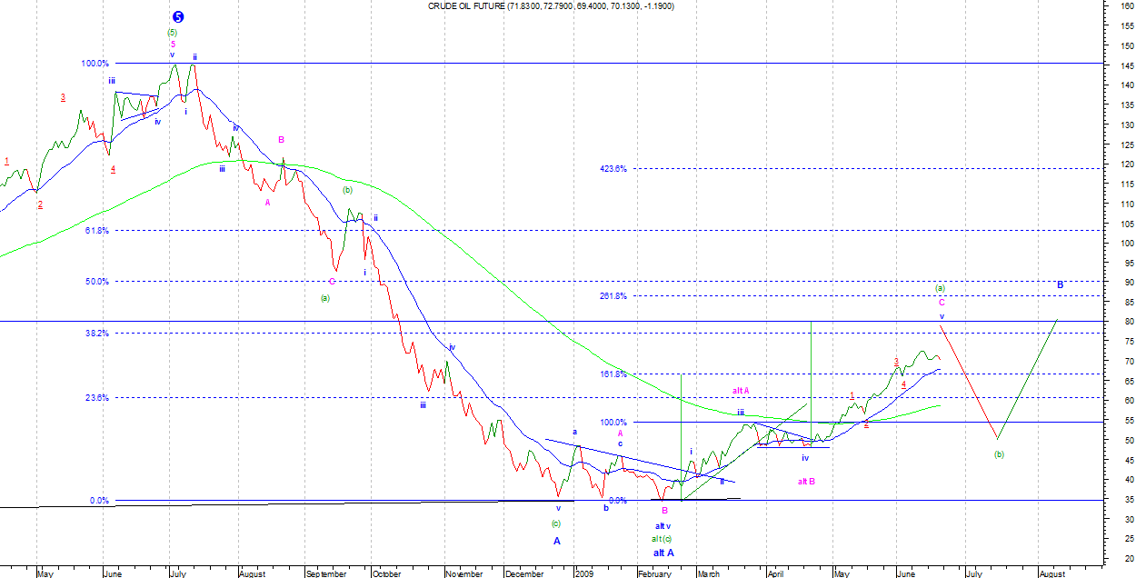 CRUDE (interwał weekly i EOD, 60 min):Nie zawróciliśmy więc zwykły Zigzag odpada . Pozostaje Elongated ale tam nie ma jak wyznaczyć zasięgu bo fale w takim Zigzagu z reguły nie wchodzą w relacje Fibonacciego, lub wydłużona piątka z zasięgiem 80 USD. EZ mógł skończyć się na ostatnich szczytach ale nie sądzę bo Crude na tyle zerwała przyczepność, że chwilowo nie zachowuje tradycyjnej odwrotnej korelacji z USD. Na wykresie 60 min rozpisałem fale do stopnia Sub Minuette. Widać wyraźnie równość fali pierwszej i trzeciej (choć ta druga prawidłowo minimalnie dłuższa). W takim wypadku należy spodziewać się wydłużonej piątki. Zejście poniżej fali 4 Minuette zakończy impuls wzrostowy.