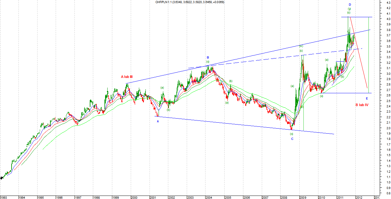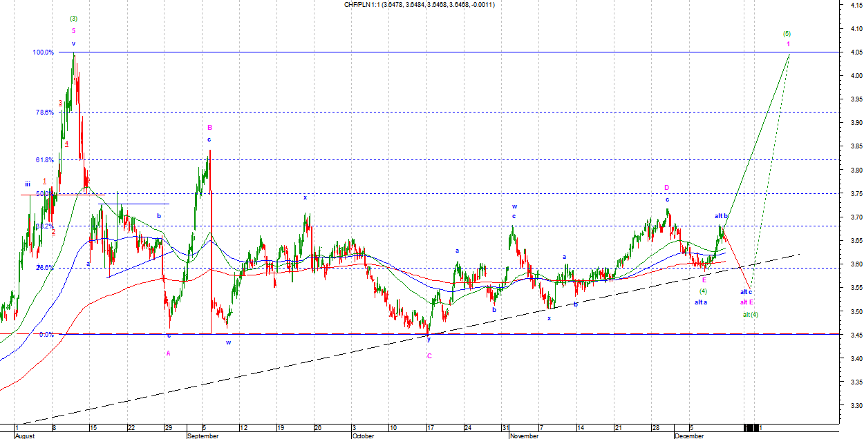Na Franku nowa wersja bycza to inne rozpisanie trójkąta jako fala (4) Intermediate. Tu możliwe jest rozwiązanie takie, że fala E Minor została już zakończona i rozpoczęły się impulsowe wzrosty w ramach fali (5) Intermediate. Fala ta jednak byłaby dość krótka pod względem czasu w stosunku do pozostałych. Nie wykluczam więc dalszego meandrowania w okolicach wzrostowej linii trendu przed rozpoczęciem finalnego ruchu. Sama fala E może być również trójkątem, przypominam.