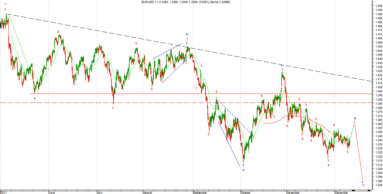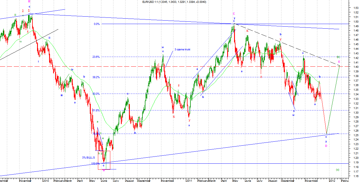 Na EDKU małe szaleństwo ale koniec końców jednak rynek dotarł do poziomu równości y=w, o którym pisałem w poprzednim komentarzu (1.330). Niemniej nie wierzę aby dziś ktoś przynajmniej kilka razy wyleciał na stopach. Przed tym również przestrzegałem. Tak niestety wyglądają ruchy korekcyjne. Obecnie falę b Minuette uznaję za zakończoną. Dalszy spadek będzie wymagał zmiany prezentowanych oznaczeń, gdyż te postulują rozpoczęcie impulsowych wzrostów. To wymagałoby pozytywnych informacji ze szczytu Unii, w co nie bardzo chce mi się wierzyć. Strategia gry zgodnie z sygnałem. Krótkich intra na razie był nie grał a zaczekał na ewentualny sygnał do pozycyjnej krótkiej. Jeżeli chodzi o długie intra to można próbować na pokazanych poziomach. Pierwszy z nich znajduje się wewnątrz nowego kanału spadkowego. Wg mnie bezpieczniej jest zaczekać na wybicie z niego.