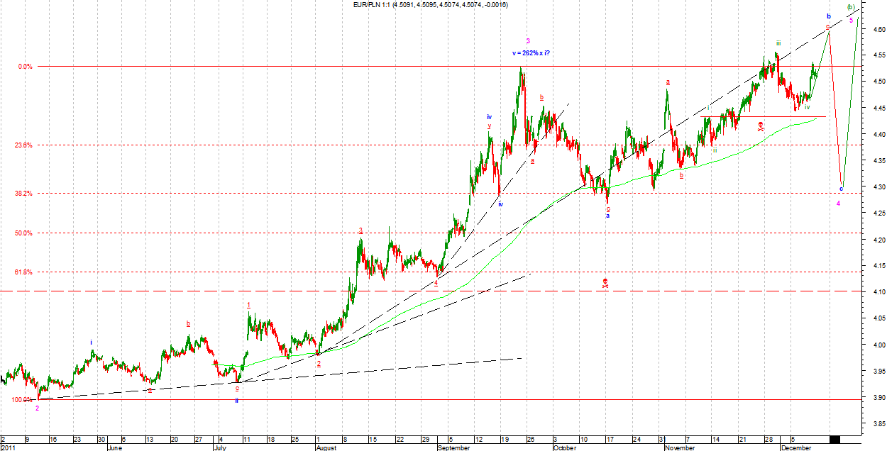 Na EUR/PLN układ podobny do USD/PLN. Tu też kończę falę czwartą na trójkącie jako fala y niższego rzędu. Fala v Sub-Minuette musi rozwinąć się w pięciofalowy impuls. Strategia gry to pozycje długie intra przy każdym poprawieniu maksimów. Jutro, jeżeli otworzymy się luką możliwy hook trade, ale i tu byłbym ostrożny bo luki możemy nie domknąć jeżeli rynku wpadną w panikę. Pozycja krótka będzie zasadna po przebiciu w dół poziomu 4.465 lub bezpieczniej 4.445.