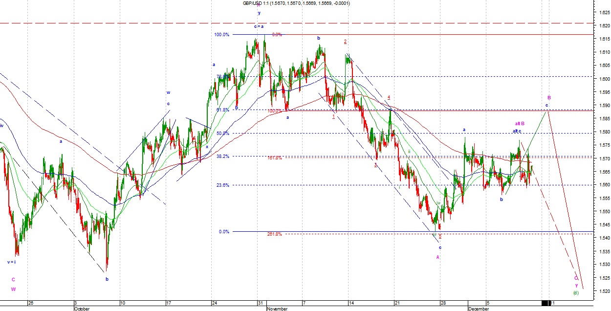 Nie wykluczam jednak, że kreślony jest rozleglejszy trójkąt abcde stopnia Minute. Na razie drugorzędne znaczenie ma to, czy jest to czwórka w impulsie (jedna z fal zachodzi wyraźnie na jedynkę ale jeżeli całość zakończy się powyżej to będzie do puszczenia), czy fala X w podwójnej trójce. Ważne, że ruch wzrostowy musi być kontynuowany do okolic górnego ograniczenie TR. Zejście na nowe minima zaneguje notację zakładającą rozpoczęcie wzrostowej fali d.