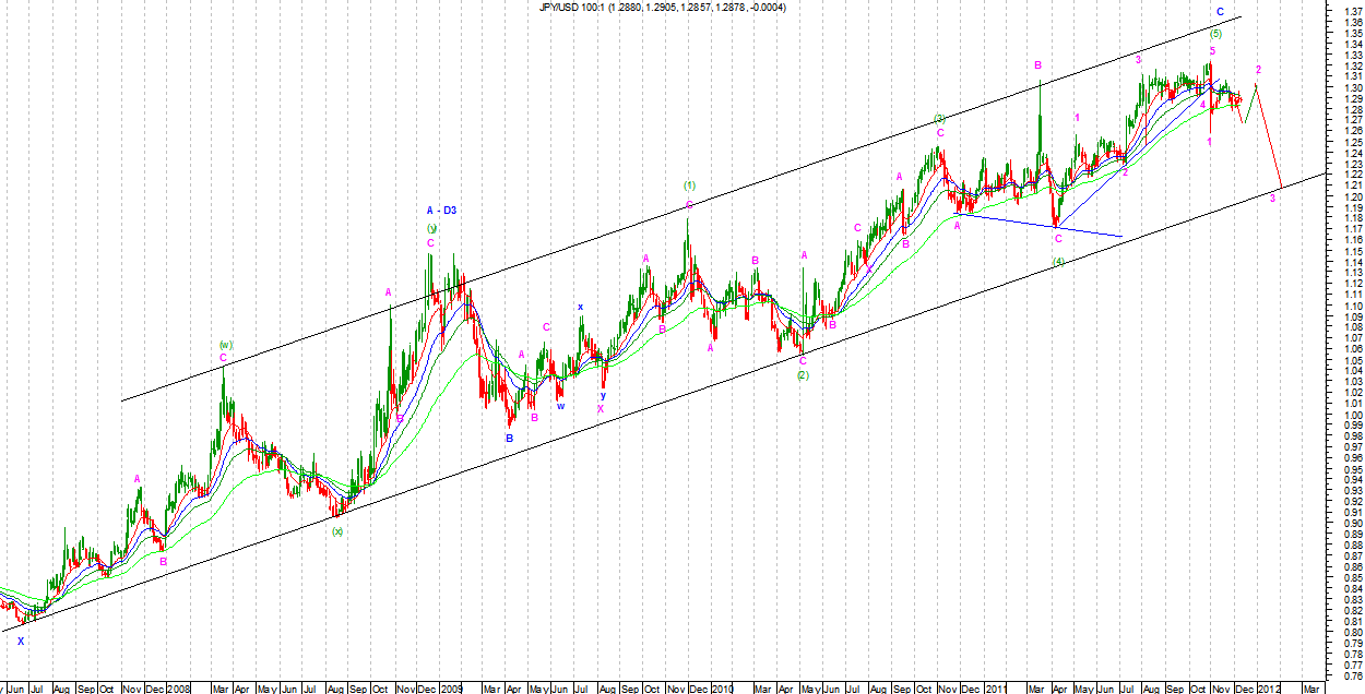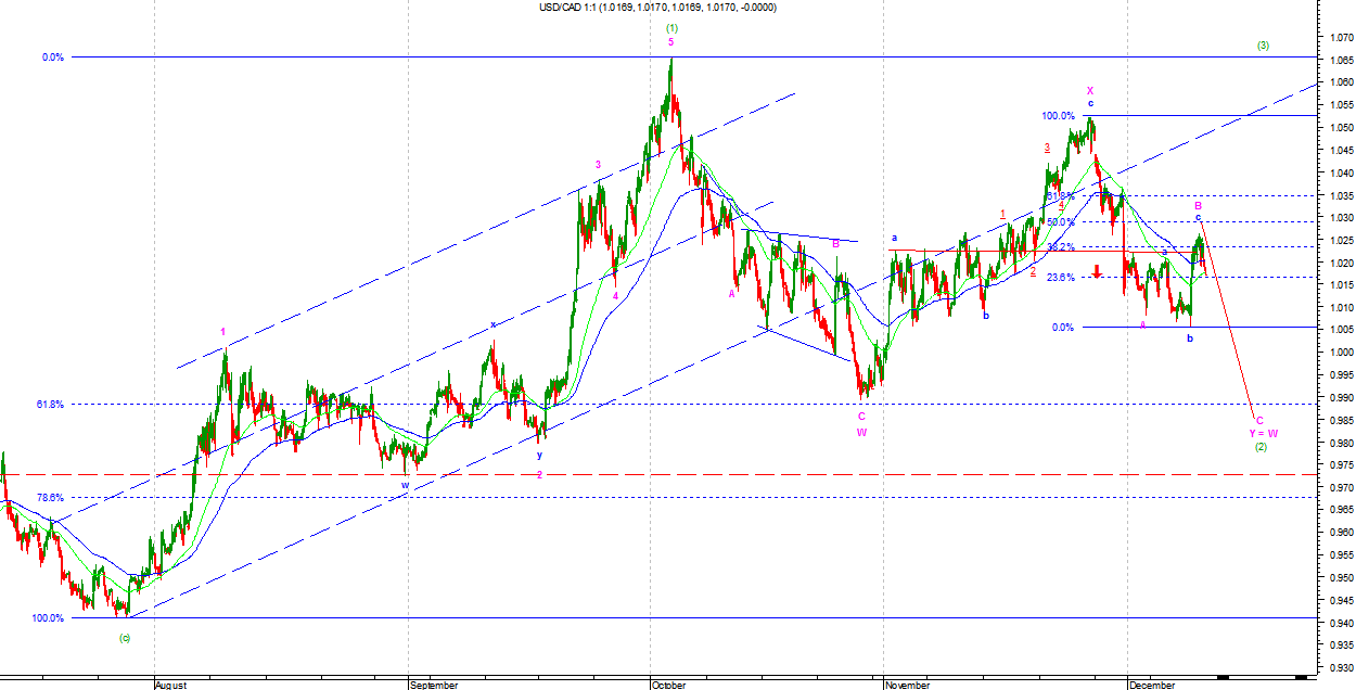 Na Loonie w wersji pierwszej powinniśmy zawrócić kreśląc falę C Minor. Zejście na nowe minima potwierdzi wstępnie tę hipotezę.
