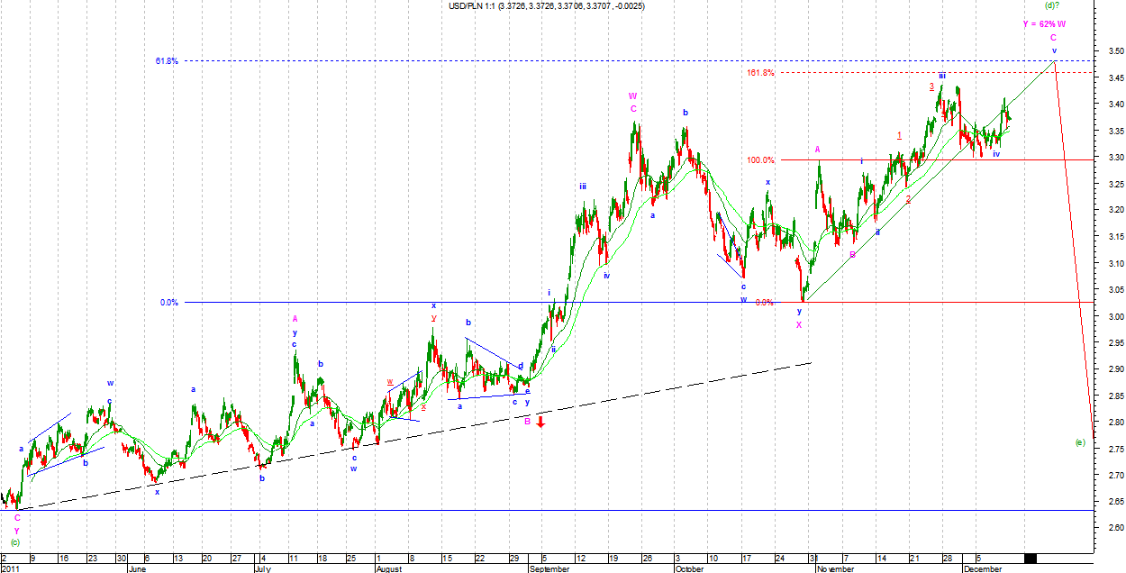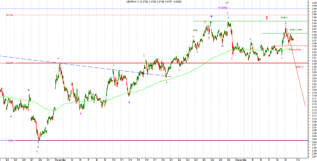 Na USD/PLN miałem zdaje się nosa, że nie zrezygnowałem z byczych oznaczeń. Ostatnie ruchy w ramach fali iv Minute to, o ile fala wzrostowa będzie kontynuowana, ciekawy przypadek podwójnej trójki z trójkątem jako fala y Minuette oraz trójkątem jako podfala e w tym trójkącie. Rzadki przypadek, dlatego zwracam na niego uwagę. Musi on być jednak potwierdzony kontynuacja impulsowych wzrostów, gdyż nie jest to jedyny sposób traktowania tej formacji. Strategia gry to pozycje długie intra przy każdym poprawieniu maksimów. Jutro, jeżeli otworzymy się luką możliwy hook trade ale byłbym ostrożny bo luki możemy nie domknąć jeżeli rynku wpadną w panikę. Pozycja krótka będzie zasadna po przebiciu w dół poziomu 3.315.
