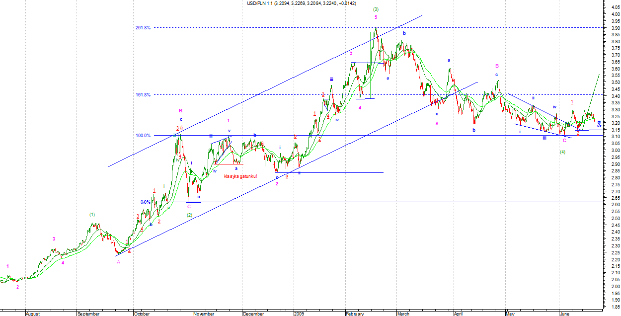 Tu również nabieram podejrzeń co do oznaczeń. Wyjście z klina to dynamiczny ruch co najmniej do jego podstawy a tu mamy co? Boczniaka. Nie podoba mi się to. Albo wygenerujemy silny ruch w zakładanym kierunki, albo notacja idzie do kosza. Zejście poniżej fali 2 zaneguje oznaczenia.
