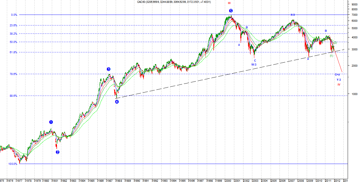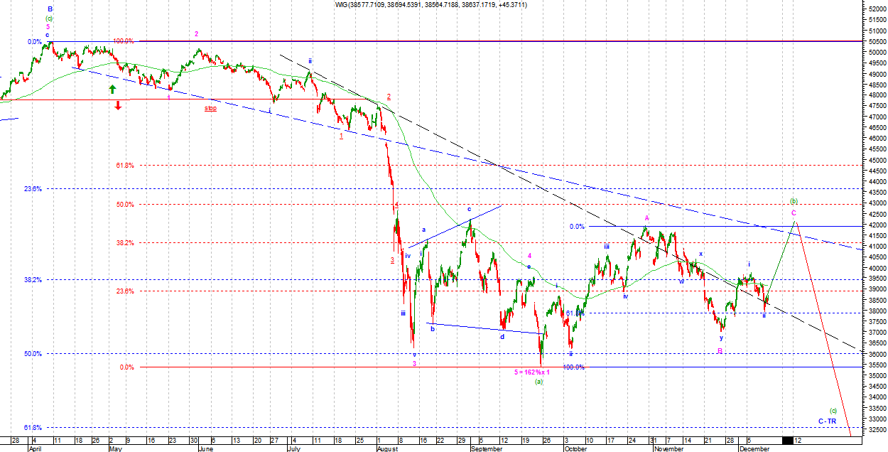 Dla CAC40 być może rozpoczęła się podfala C Minor. Wymaga to jednak potwierdzenia kontynuacją ruchu wzrostowego powyżej szczytu fali A Minor. Gdyby tak się nie stało to hipoteza o zakończeniu fali B Minor upadnie. Fala ta ma miejsce na ewentualne spadki do okolic 3000 pkt. Niższe zejście zaneguje notację.