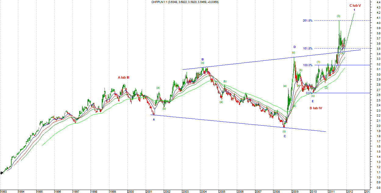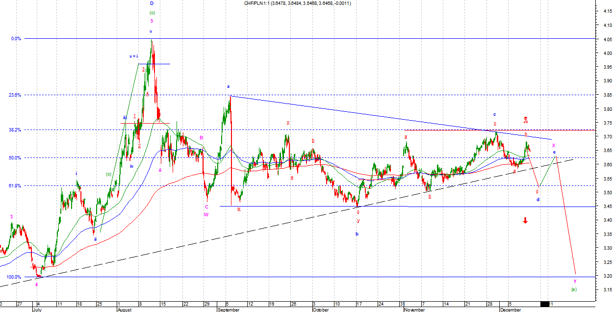 Na Franku nowa wersja bycza to inne rozpisanie trójkąta jako fala (4) Intermediate. Tu możliwe jest rozwiązanie takie, że fala E Minor została już zakończona i rozpoczęły się impulsowe wzrosty w ramach fali (5) Intermediate. Fala ta jednak byłaby dość krótka pod względem czasu w stosunku do pozostałych. Nie wykluczam więc dalszego meandrowania w okolicach wzrostowej linii trendu przed rozpoczęciem finalnego ruchu. Sama fala E może być również trójkątem, przypominam.