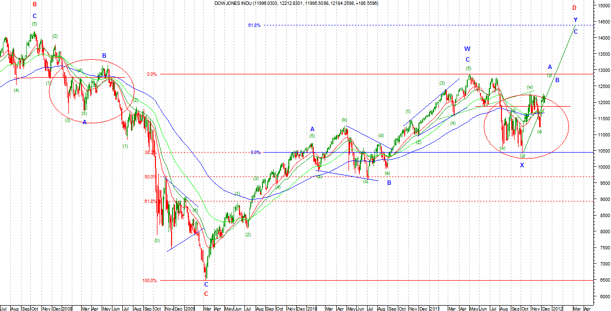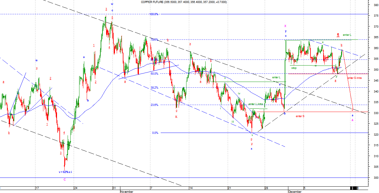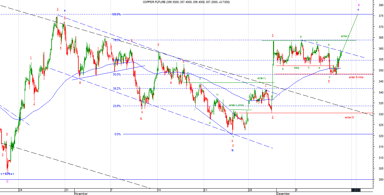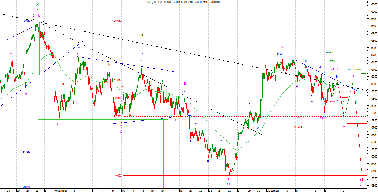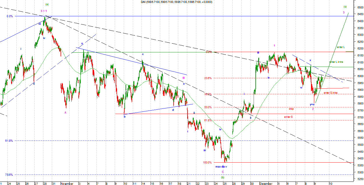 Na DJIA i SP500 w wersji byczej kreślona jest podfala (b) Intermediate lub zakończyła się ona na ostatnich minimach. Jeżeli był to koniec to była ona wyjątkowo słaba i świadczy o dużej sile amatorów premii na koniec roku. Ostatnia fala wzrostowa wygląda impulsowo, ale nie mogę wykluczyć, ze jest to c we Flat jako B Minor. W związku z tym nie wykluczam jednak, że fala (b) rozszerzy się nieco w czasie i zasięgu. Strategia gry zgodnie z sygnałem.