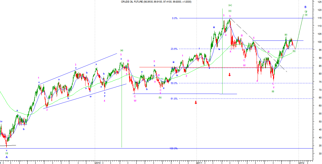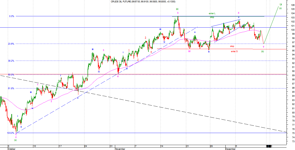 Na CRUDE ruch wzrostowy w ramach fali X Minor został zakończony. Nieco zmieniłem fale wewnętrzne bo wydaje mi się, że lepiej będzie pracował ED jako fala c Minute w X. Fala Y powinna dotrzeć więc do jego podstawy, czyli okolic 95 USD. Jeżeli ktoś chce się bawić w zajmowanie pozycji wewnątrz horyzontalnego zakresu 95-103 USD niech robi to na własną rękę z zachowaniem obowiązującego kierunku. Wg mnie na korekcyjnych układach częściej się traci niż zarabia więc zaczekałbym na sygnał i pozycyjne granie.