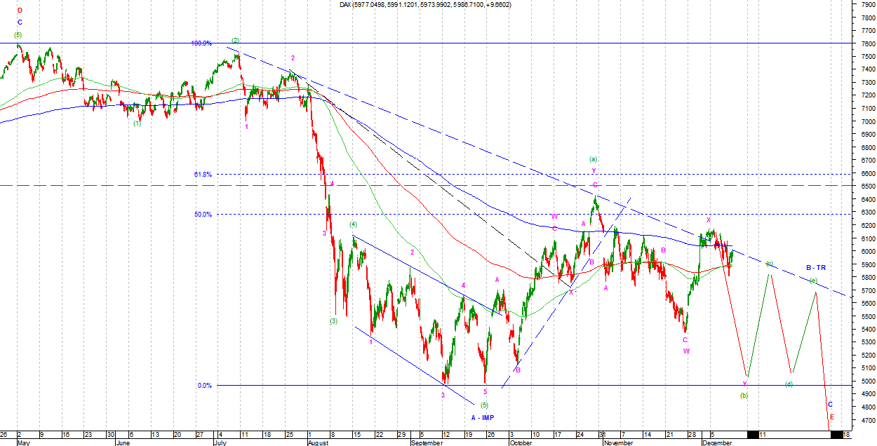 Na DAX mimo spadków nie ma na razie mowy o impulsie spadkowym. Ruch jest rwany z dużą ilością zachodzeń. Nie zmienia to na jotę oznaczeń gdyż fala A Minor, którą postuluje notacja może przybierać różne formy, z D3 włącznie. Oznacza to jedynie, że gra kontraktowa będzie trudna, z dużą ilością stop losów. Pierwsza trójka W Minor była Zigzagiem. Druga trójka Y będzie strukturą typu Flat. Tylko we Flat bowiem podfala A może mieć korekcyjny charakter. Obecnie najprawdopodobniej kreślona jest podfala a Minute w y Minute w A Minor. Cała fala A może zakończyć się w okolicach 5750 pkt. Z tych okolic powinniśmy zobaczyć dość silną falę B Minor, która może podejść spokojnie do spadkowej linii trendu. Dopiero fala C Minor powinna być bardziej czytelna i łatwiejsza do gry. Strategia gry zgodnie z v2.