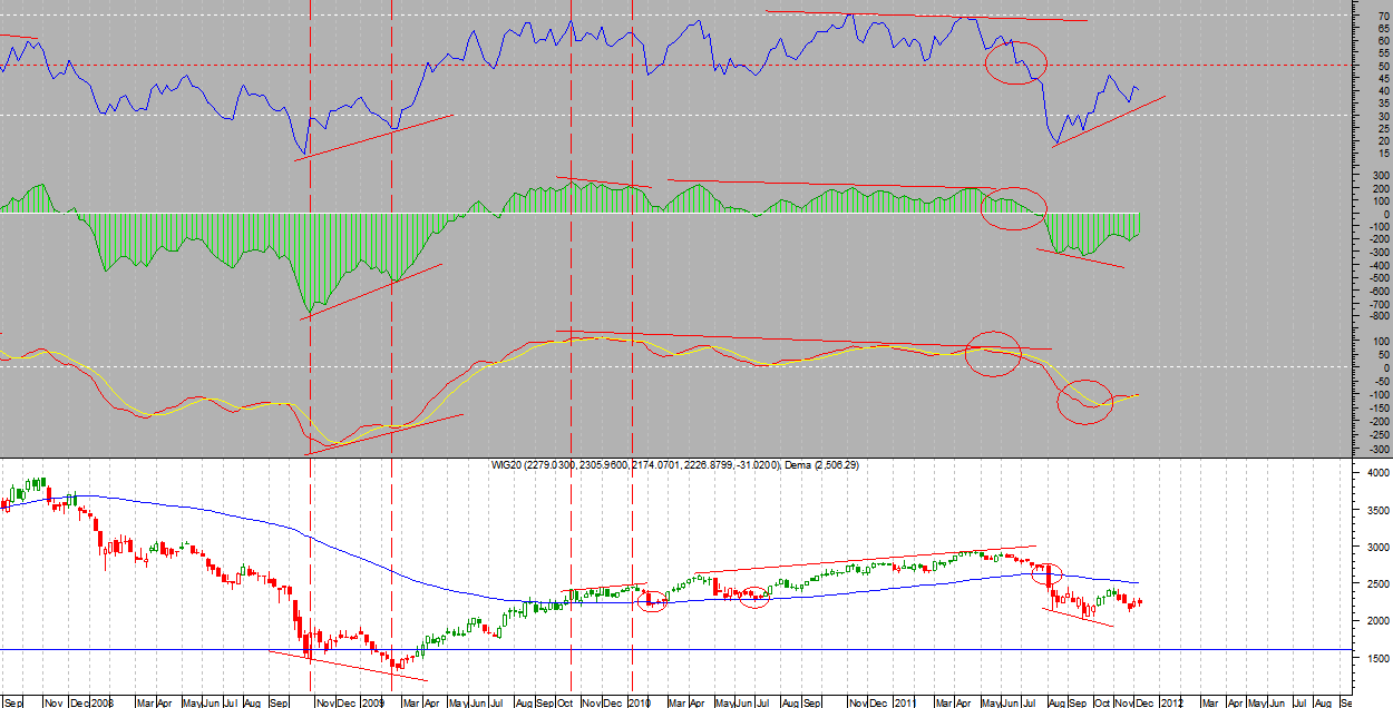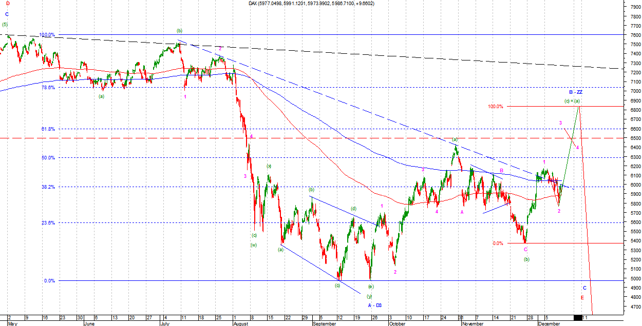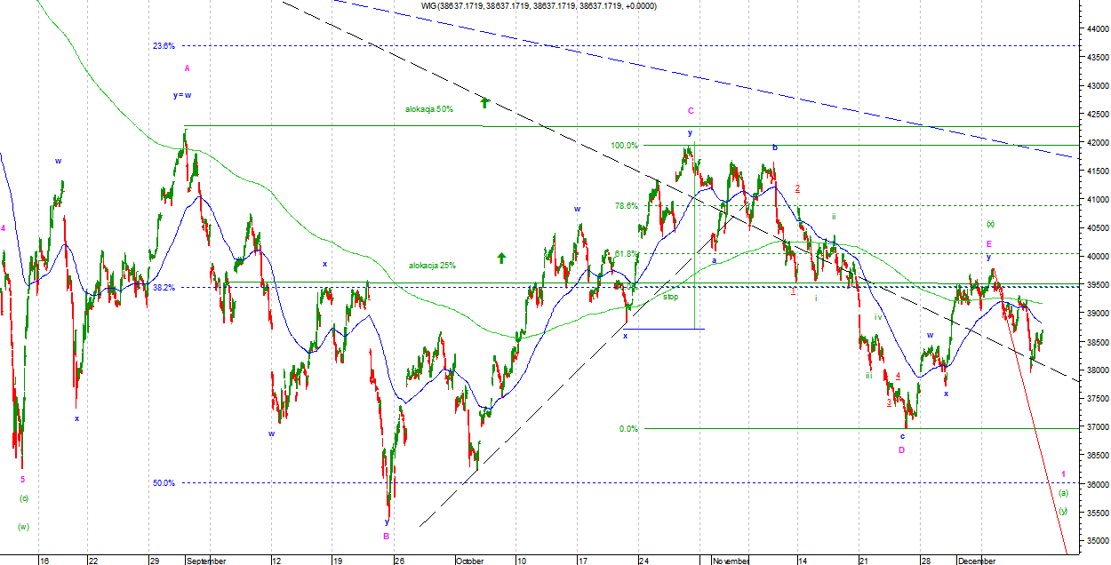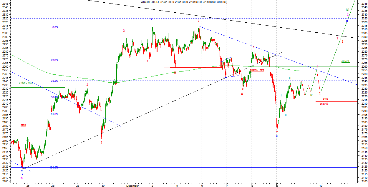Na DJIA i SP500 zakończyła się podfala 5 Minor w fali (a) Intermediate. Na DJIA przybrała ona formę ED i miała długość typową dla piątki w impulsie bo 62% fali pierwszej. Na SP500 takiej struktury nie da się rozpisać i samo oznaczenie fali piątej nastręcza trochę trudności. Zakładam jednak, że zakończyła się w tym samym miejscu co na DJIA. Zasięg miała również typowy (62% fali pierwszej). Obecnie na obu indeksach kreślona jest podfala (b). Fale (b) w ZZ nie należą do głębokich i znoszą typowo do 50% fali (a). Na rozpatrywanych indeksach równość podfal spadkowych wypada właśnie na 50% zniesieniu. Rynek za oceanem kozakuje trochę i walczy o dobre zamknięcie roku więc ten zasięg nie musi zostać osiągnięty.