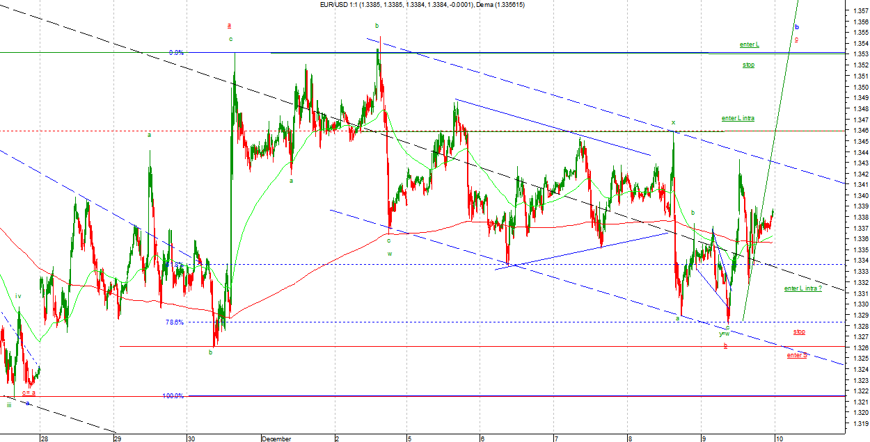 Na EDKU małe szaleństwo ale koniec końców jednak rynek dotarł do poziomu równości y=w, o którym pisałem w poprzednim komentarzu (1.330). Niemniej nie wierzę aby dziś ktoś przynajmniej kilka razy wyleciał na stopach. Przed tym również przestrzegałem. Tak niestety wyglądają ruchy korekcyjne. Obecnie falę b Minuette uznaję za zakończoną. Dalszy spadek będzie wymagał zmiany prezentowanych oznaczeń, gdyż te postulują rozpoczęcie impulsowych wzrostów. To wymagałoby pozytywnych informacji ze szczytu Unii, w co nie bardzo chce mi się wierzyć. Strategia gry zgodnie z sygnałem. Krótkich intra na razie był nie grał a zaczekał na ewentualny sygnał do pozycyjnej krótkiej. Jeżeli chodzi o długie intra to można próbować na pokazanych poziomach. Pierwszy z nich znajduje się wewnątrz nowego kanału spadkowego. Wg mnie bezpieczniej jest zaczekać na wybicie z niego.