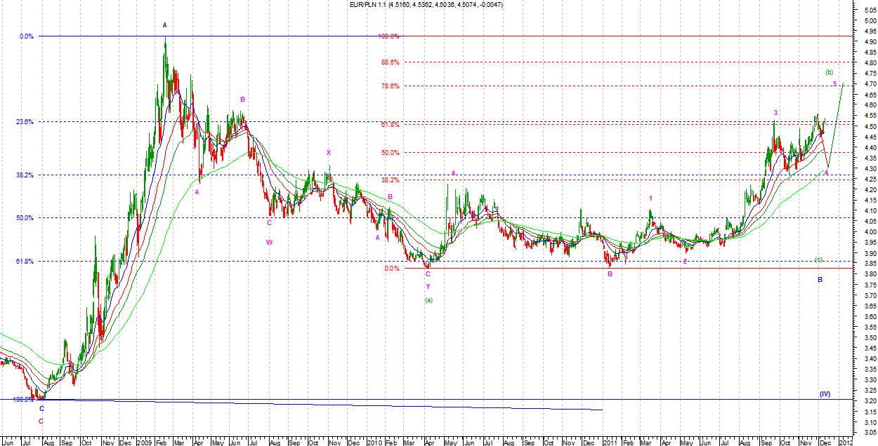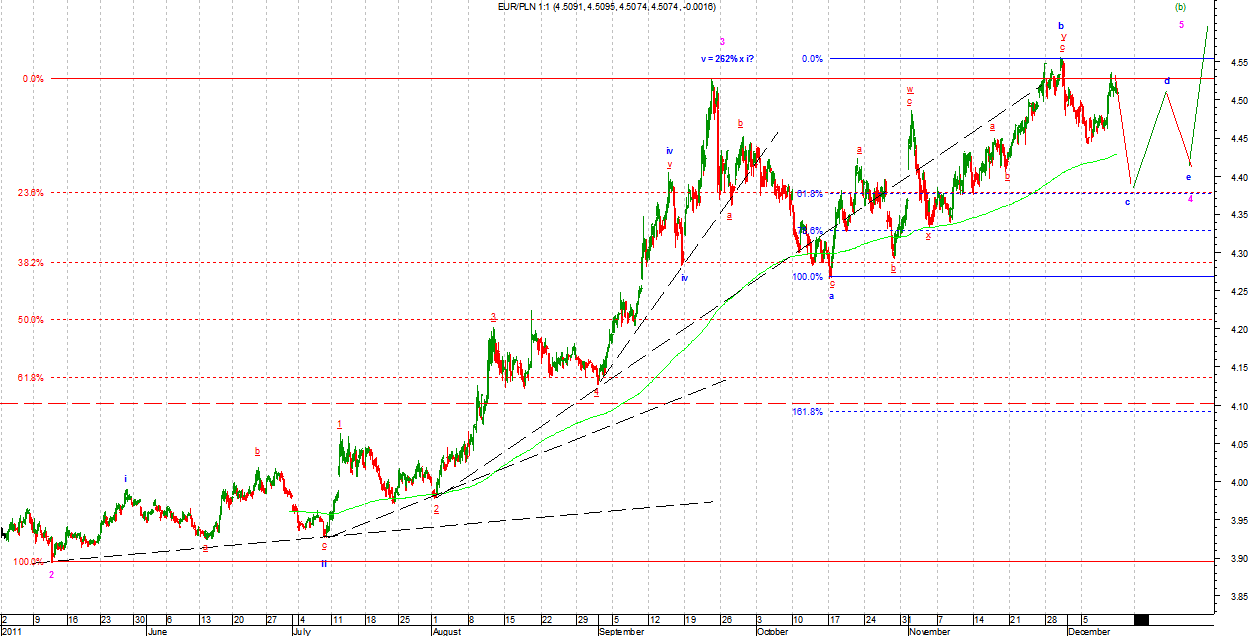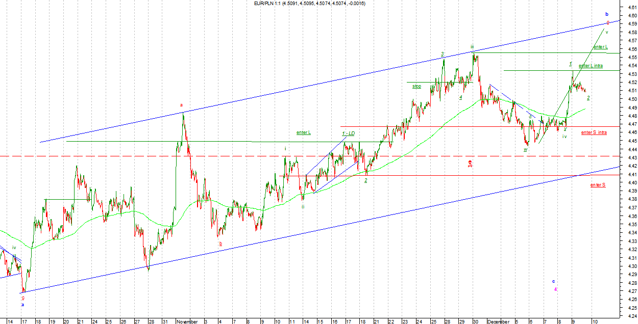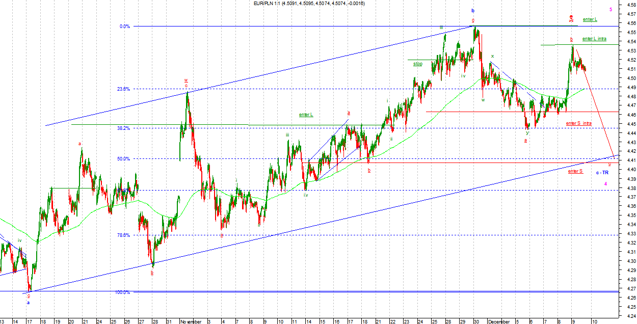 Na EUR/PLN układ podobny do USD/PLN. Tu też kończę falę czwartą na trójkącie jako fala y niższego rzędu. Fala v Sub-Minuette musi rozwinąć się w pięciofalowy impuls. Strategia gry to pozycje długie intra przy każdym poprawieniu maksimów. Jutro, jeżeli otworzymy się luką możliwy hook trade, ale i tu byłbym ostrożny bo luki możemy nie domknąć jeżeli rynku wpadną w panikę. Pozycja krótka będzie zasadna po przebiciu w dół poziomu 4.465 lub bezpieczniej 4.445.