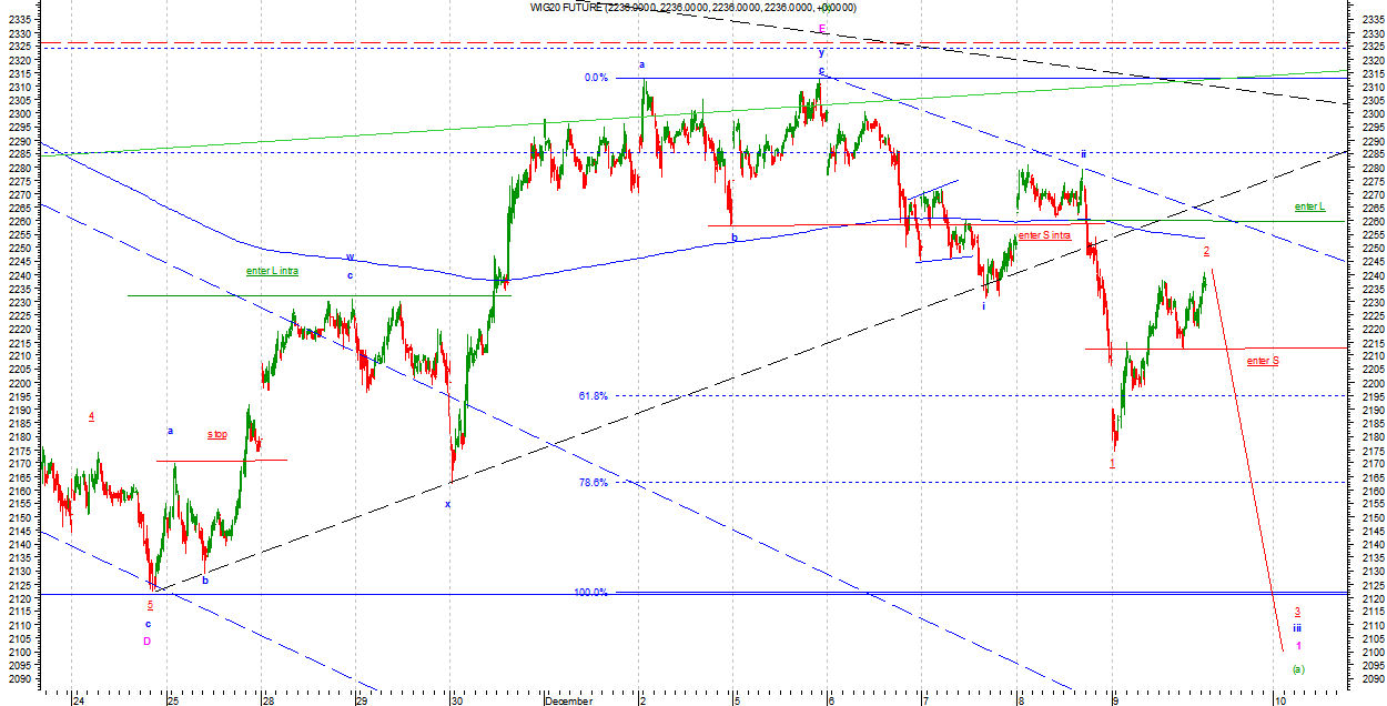 Na FW20 zakończenie struktury abc Minuette skutkowało dość znaczącym podejściem. Podejściem, które w razie kontynuacji mogło uchodzić za impuls wzrostowy. Nic z tych rzeczy. Późniejsze ruchy zweryfikowały sentyment obrońców linii trendu. Jest to podręcznikowy przykład powstawania fal silnych fal x w złożonych strukturach. Gdy okazało się, że byki są w błędzie w panice się tratowały. Wg oznaczeń jest to podfala y Minuette. Jej równość z falą w Minuette wybada dokładnie na 62% zniesieniu fali wzrostowej (2195 pkt). Jest to poziom, do którego sensowne jest rozpatrywanie tego oznaczenia jako poprawne. Zamknięcie znacząco poniżej będzie dawało tylko teoretyczne szanse na kontynuację ruchu w górę (poniżej 10%). Strategia gry to pozycja krótka po 2260 pkt (przetrzymana krótka intra) ze stopem na 2215 pkt.
