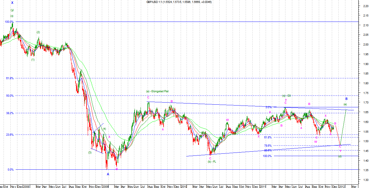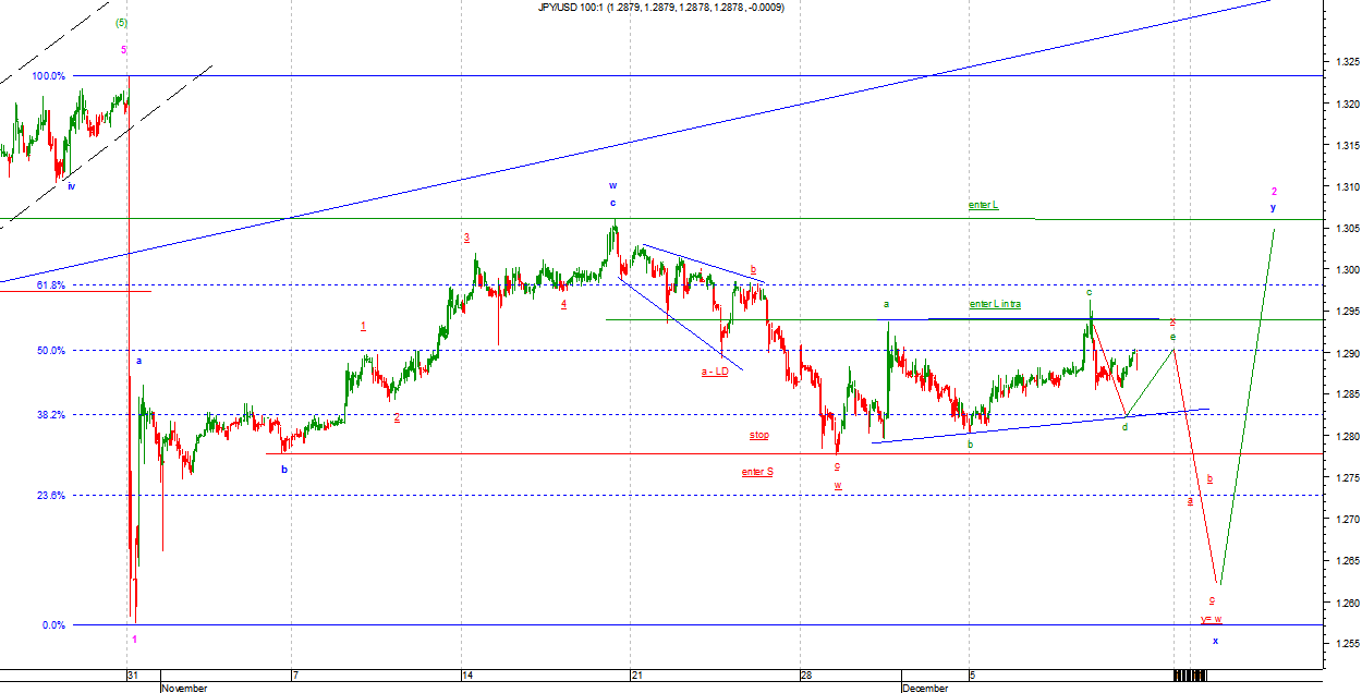 Nie wykluczam jednak, że kreślony jest rozleglejszy trójkąt abcde stopnia Minute. Na razie drugorzędne znaczenie ma to, czy jest to czwórka w impulsie (jedna z fal zachodzi wyraźnie na jedynkę ale jeżeli całość zakończy się powyżej to będzie do puszczenia), czy fala X w podwójnej trójce. Ważne, że ruch wzrostowy musi być kontynuowany do okolic górnego ograniczenie TR. Zejście na nowe minima zaneguje notację zakładającą rozpoczęcie wzrostowej fali d.