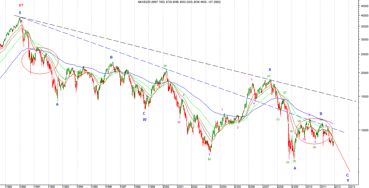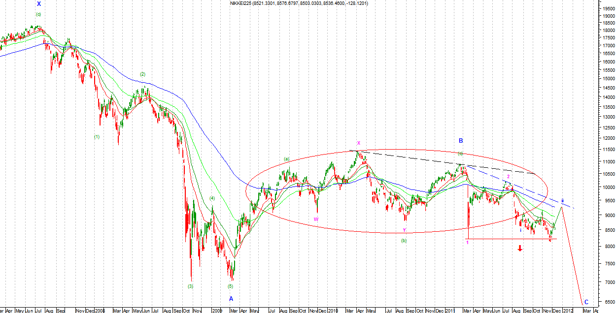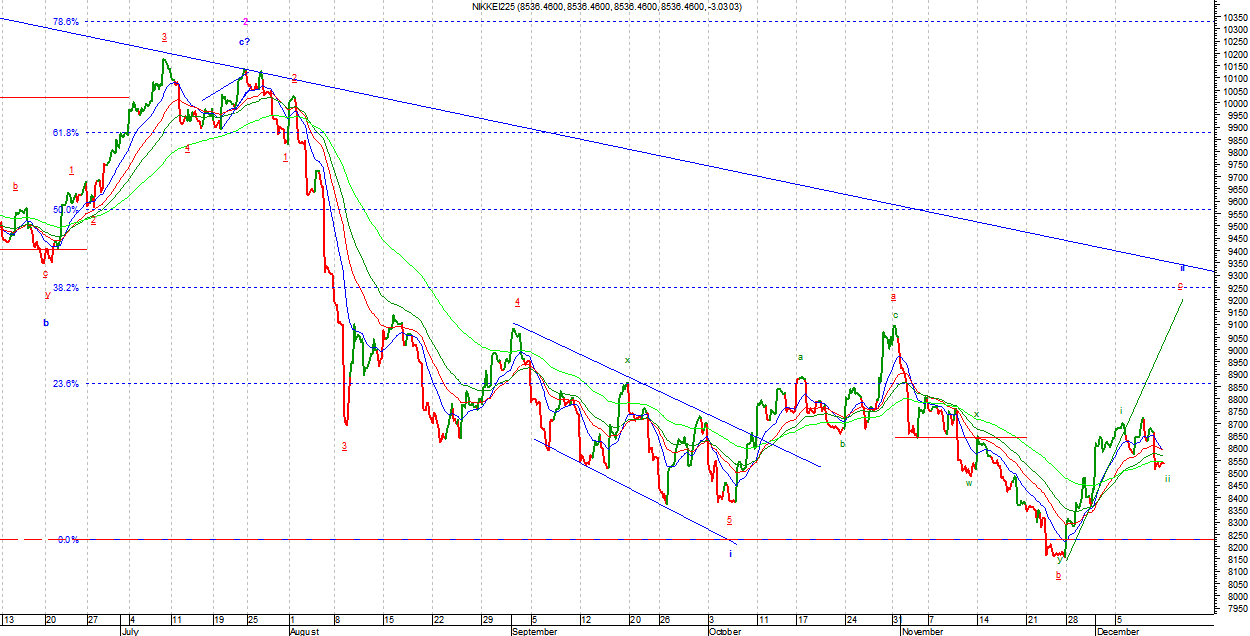 Na NIKKEI wykreślona została podfala ii Sub-Minuette. Obecnie powinniśmy zobaczyć falę iii Sub-Minuette w c Minuette. Całość utworzy podfalę ii Minute w ruchu w dół.