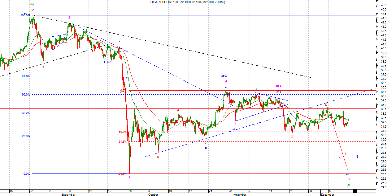 Na SILVER w opcji spadkowej ruch w dół musi być kontynuowany. Każde wyjście na nowe maksima zaneguje hipotezę o zakończeniu fali 2 Minuette.