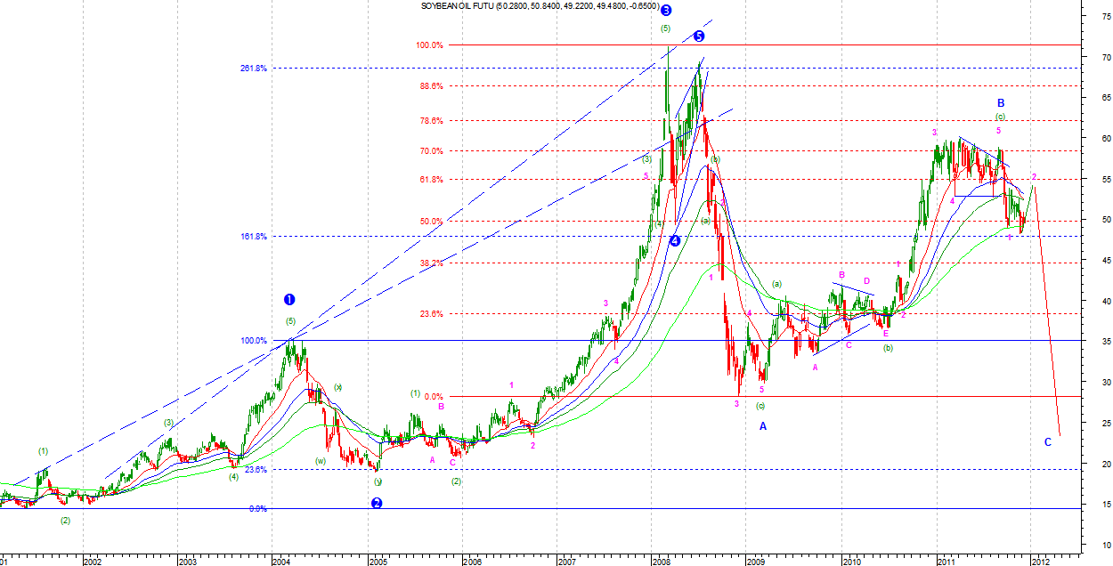 Na SOYAOIL nadal wydaje mi się, ze ostatni spadek jest trójfalowy, a to implikuje kontynuację fali drugiej w bardziej złożonej formie. Nie można wykluczyć jednak, że z tej trójki zrobi się impuls spadkowy. Oznaczać to będzie rozpoczęcie fali trzeciej w impulsie w dół.