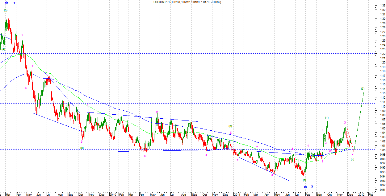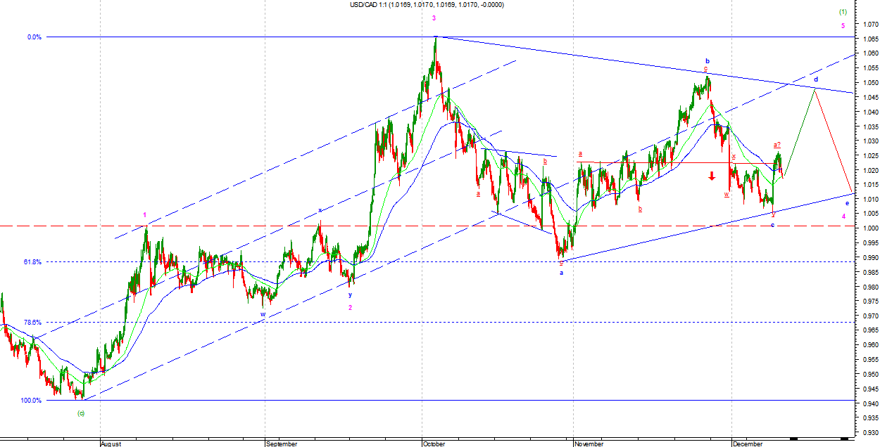 Na Loonie w wersji pierwszej powinniśmy zawrócić kreśląc falę C Minor. Zejście na nowe minima potwierdzi wstępnie tę hipotezę.