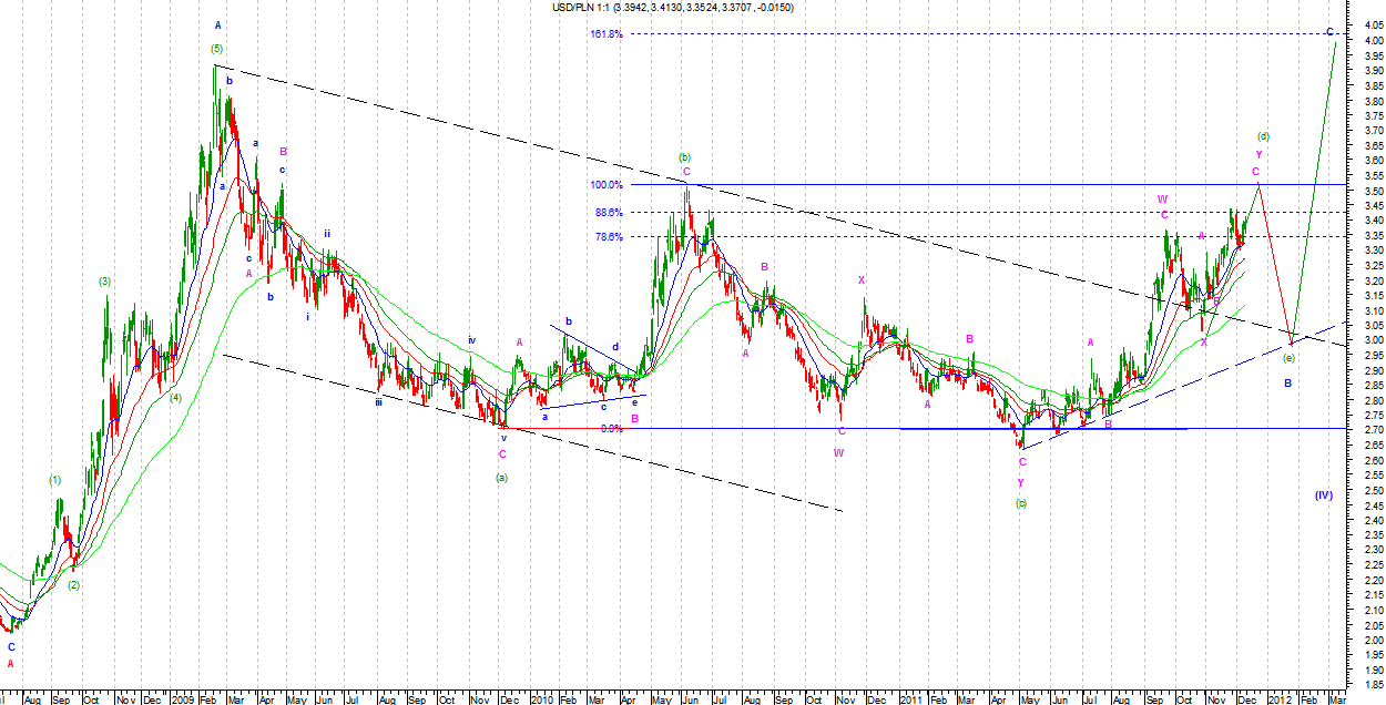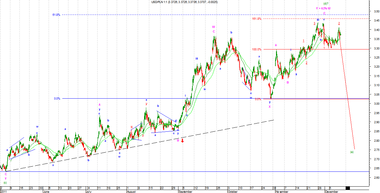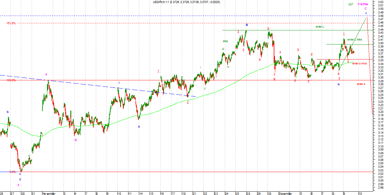 Na USD/PLN miałem zdaje się nosa, że nie zrezygnowałem z byczych oznaczeń. Ostatnie ruchy w ramach fali iv Minute to, o ile fala wzrostowa będzie kontynuowana, ciekawy przypadek podwójnej trójki z trójkątem jako fala y Minuette oraz trójkątem jako podfala e w tym trójkącie. Rzadki przypadek, dlatego zwracam na niego uwagę. Musi on być jednak potwierdzony kontynuacja impulsowych wzrostów, gdyż nie jest to jedyny sposób traktowania tej formacji. Strategia gry to pozycje długie intra przy każdym poprawieniu maksimów. Jutro, jeżeli otworzymy się luką możliwy hook trade ale byłbym ostrożny bo luki możemy nie domknąć jeżeli rynku wpadną w panikę. Pozycja krótka będzie zasadna po przebiciu w dół poziomu 3.315.