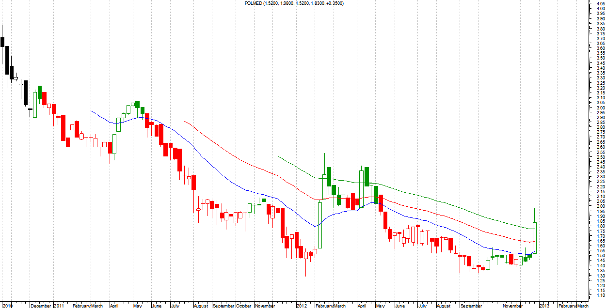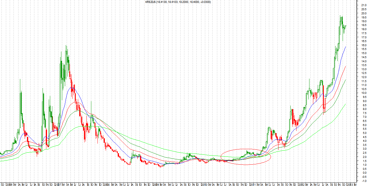 Wybór został dokonany wyłącznie na podstawie wyglądu wykresów. Szukałem spółek, które po okresie spadków wybiły się, lub miały zamiar wybić się ponad średnie kroczące, co sygnalizowało nowy trend wzrostowy. Innymi słowy, szukałem miejsc wejścia takich jak rok wcześniej na Krezusie: