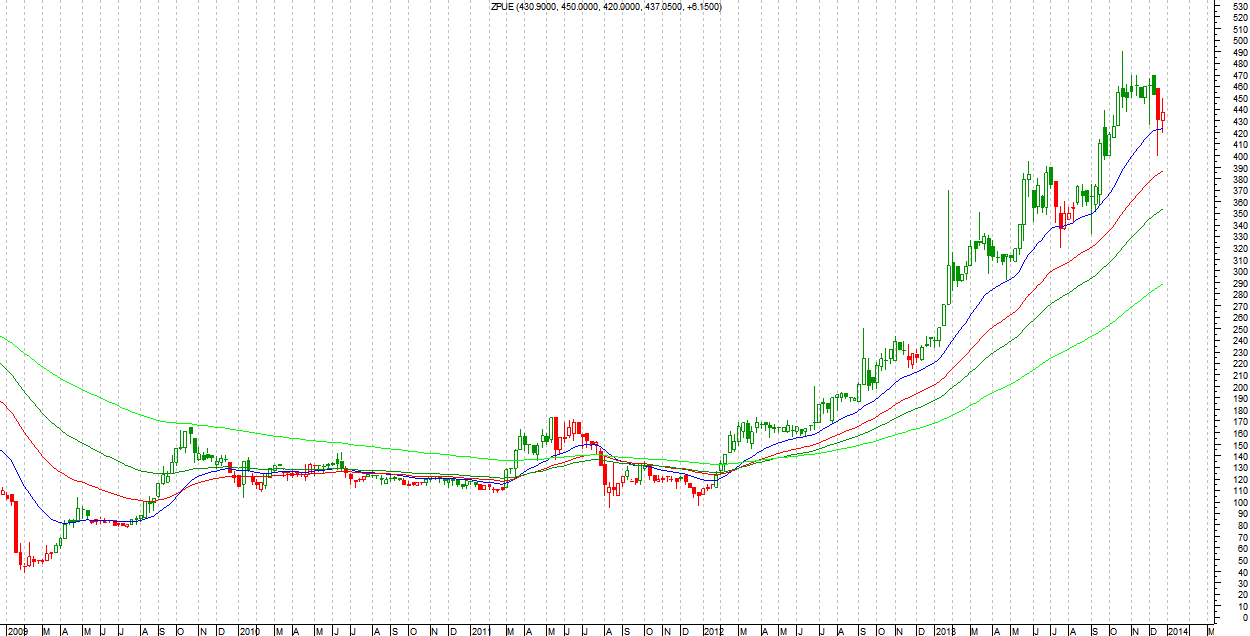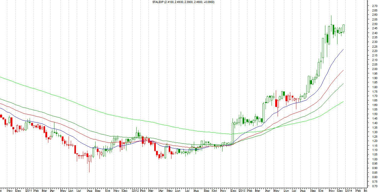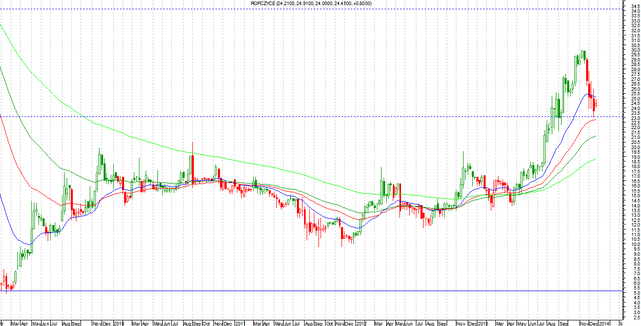 Pierwszego stycznia w specjalnym raporcie, dostępnym dla subskrybentów pełnego pakietu, podam typy na 2014 rok. Zasady te same, co w zeszłym roku. Szukać będę perspektywicznych (na wykresie) spółek, które mają szanse rozpocząć nowy trend wzrostowy lub potwierdzić już istniejący. Będę wybierał spółki o „świeżym” trendzie wzrostowym. Nie będę więc brał pod uwagę takich walorów jak LPP czy CCC. Tam trend trwa od lat. Jest aż nadto widoczny, a ryzyko, że się kiedyś skończy już, jak dla mnie, zbyt duże.