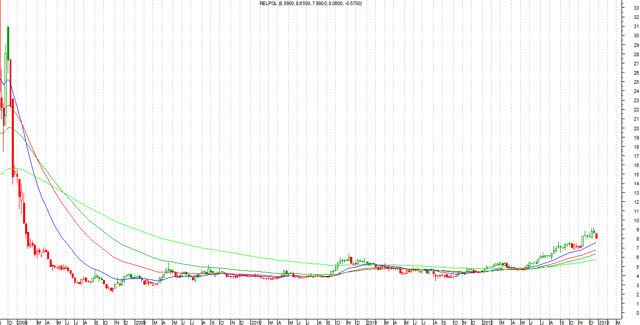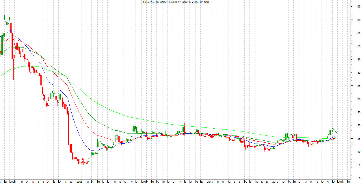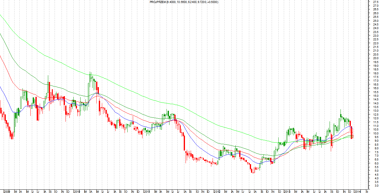 Również słabo, z niewielkim zyskiem: Kupno 8.50 PLN, obecna cena 9.70 PLN – zysk 14%. Na plus można napisać to, że spółka nadal znajduje się powyżej średnich kroczących na interwale tygodniowym.