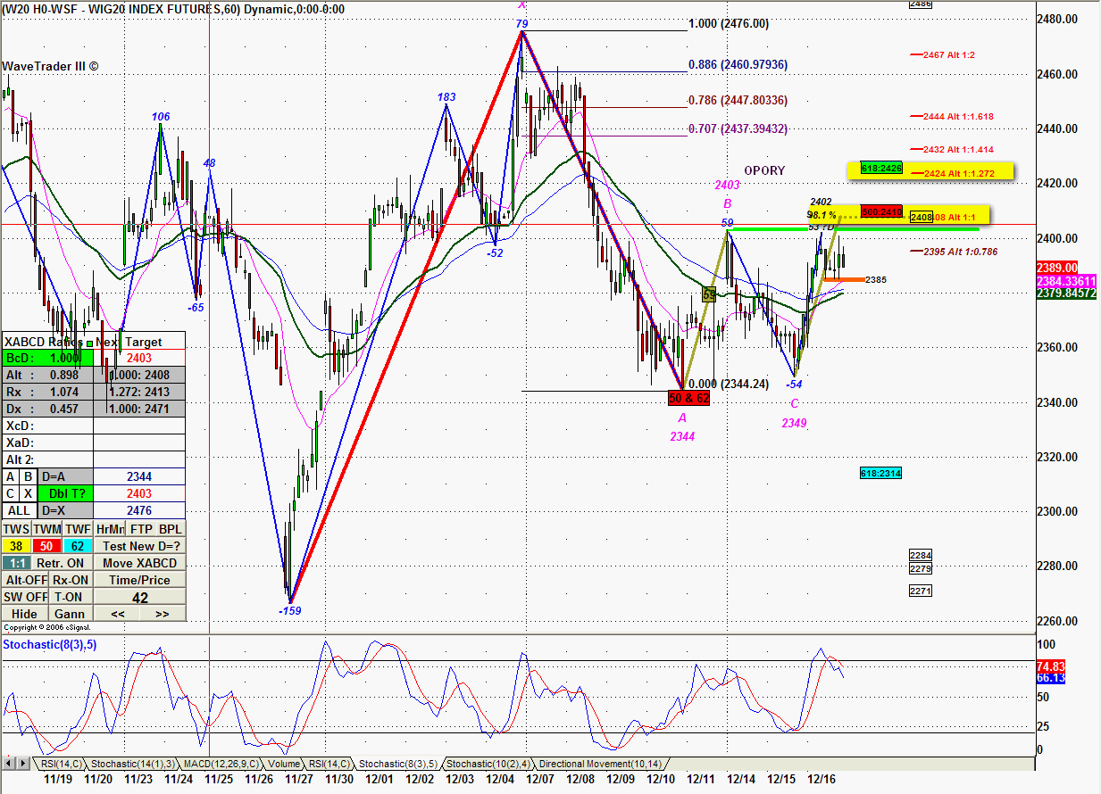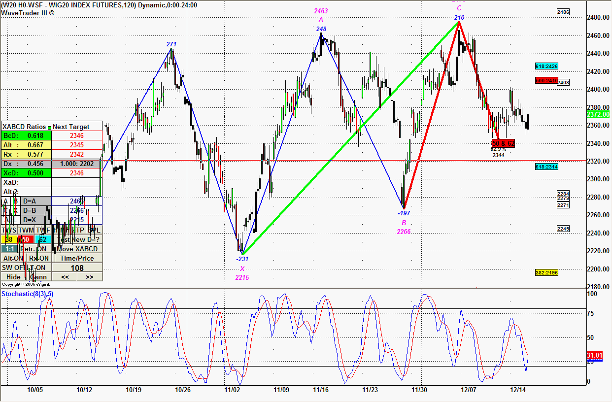 Po dotarciu do ostatniego oporu zaznaczonego w tej analizie rynek wykonał znaczne cofnięcie w geometrii dużo lepiej wyglądające na serii H. To pokazuje, iż mimo mniejszego obrotu ten rynek zachowuje się bardziej harmonicznie ( pozbawiony ewentualnego wpływu arbitrażu w najbliższych dniach związanego z wygasaniem). Dla porządku adekwatne denko na serii H zbudowane było na podwójnym zniesieniu 61,8 i 50%.