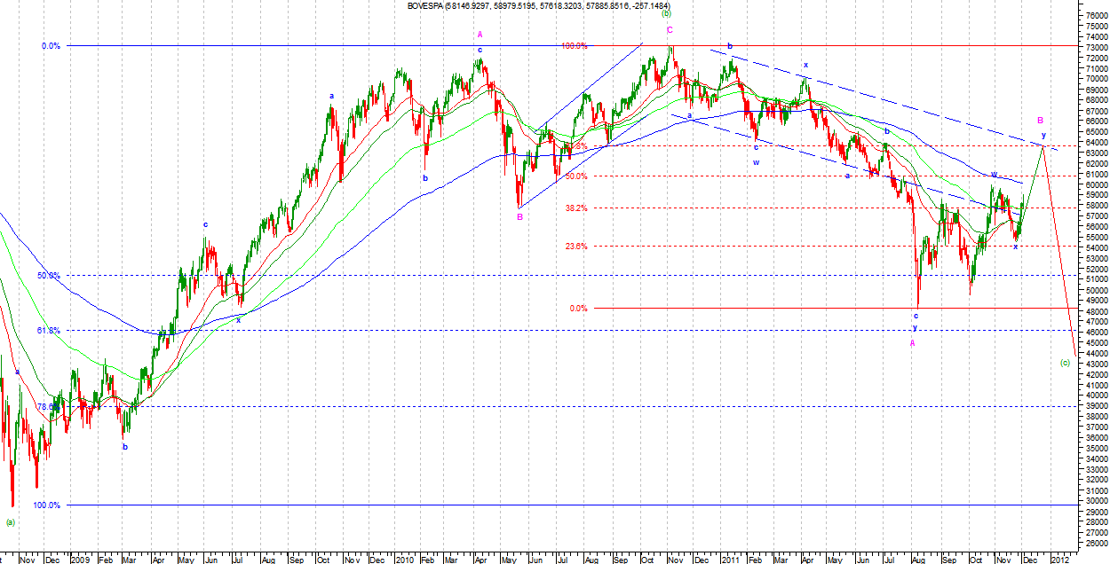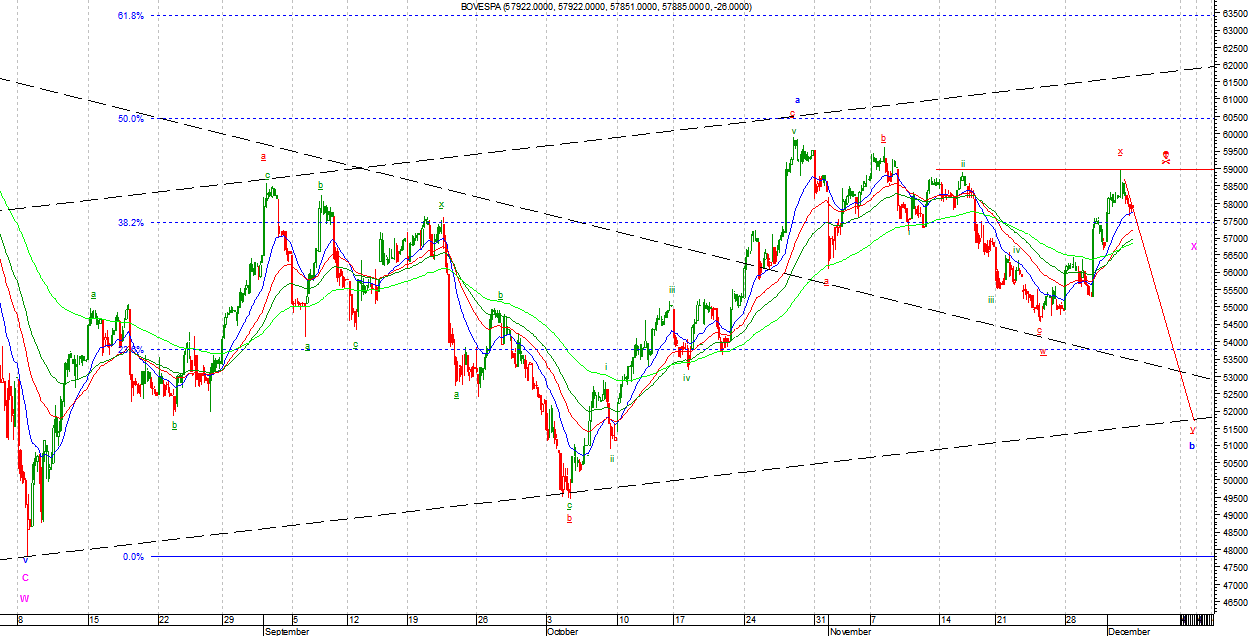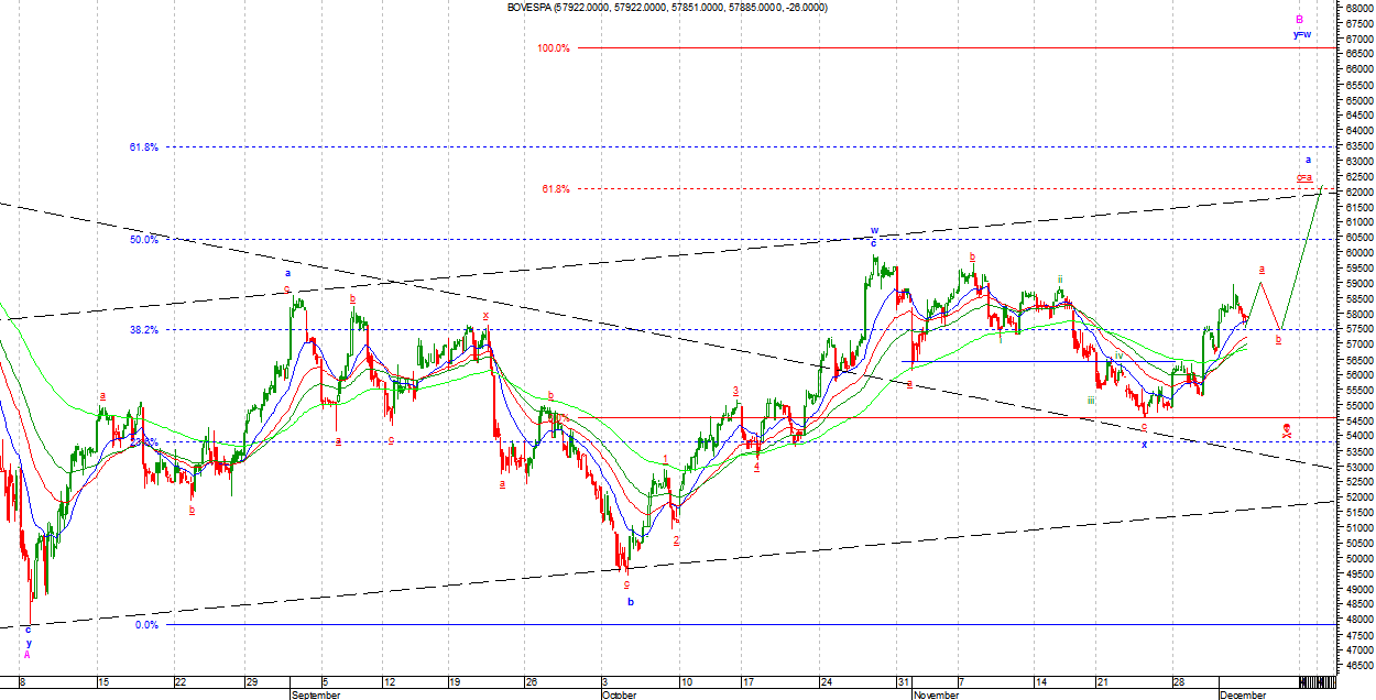 Na BOVESPIE od ostatnich dołków mamy na razie ruch wzrostowy mający siedem podfal. W takim kształcie jest to układ korekcyjny ale, jeżeli zostanie wygenerowana jeszcze jedna podfala wzrostowa, to będzie można mówić o impulsie. W wersji byczej byłaby to podfala a Minuette w Zigzagu abc jako podfala a Minute w drugiej trójce y Minute.