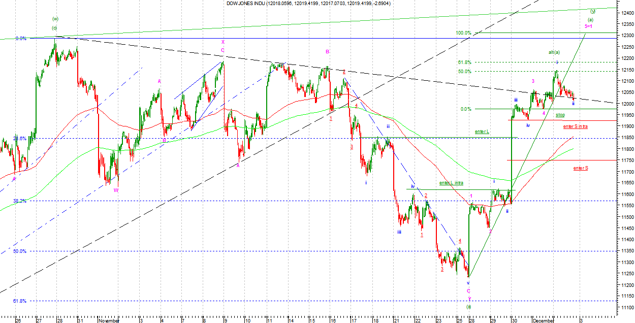 W wersji byczej zakończyła się podfala 3 Minor w (a) Intermediate drugiej trójki wzrostowej, która będzie Zigzagiem. Do zakończenia fali (a) brakuje jeszcze jednej fali wzrostowej. Powinna ona dotrzeć do okolic poprzednich maksimów. Po jej zakończeniu powinniśmy zobaczyć falę (b) Intermediate, która powinna znieść od 38% do 50% fali (a). Strategia gry to pozycja długa po 11630 pkt (przetrzymana długa intra), ze stopem na 11930 pkt.