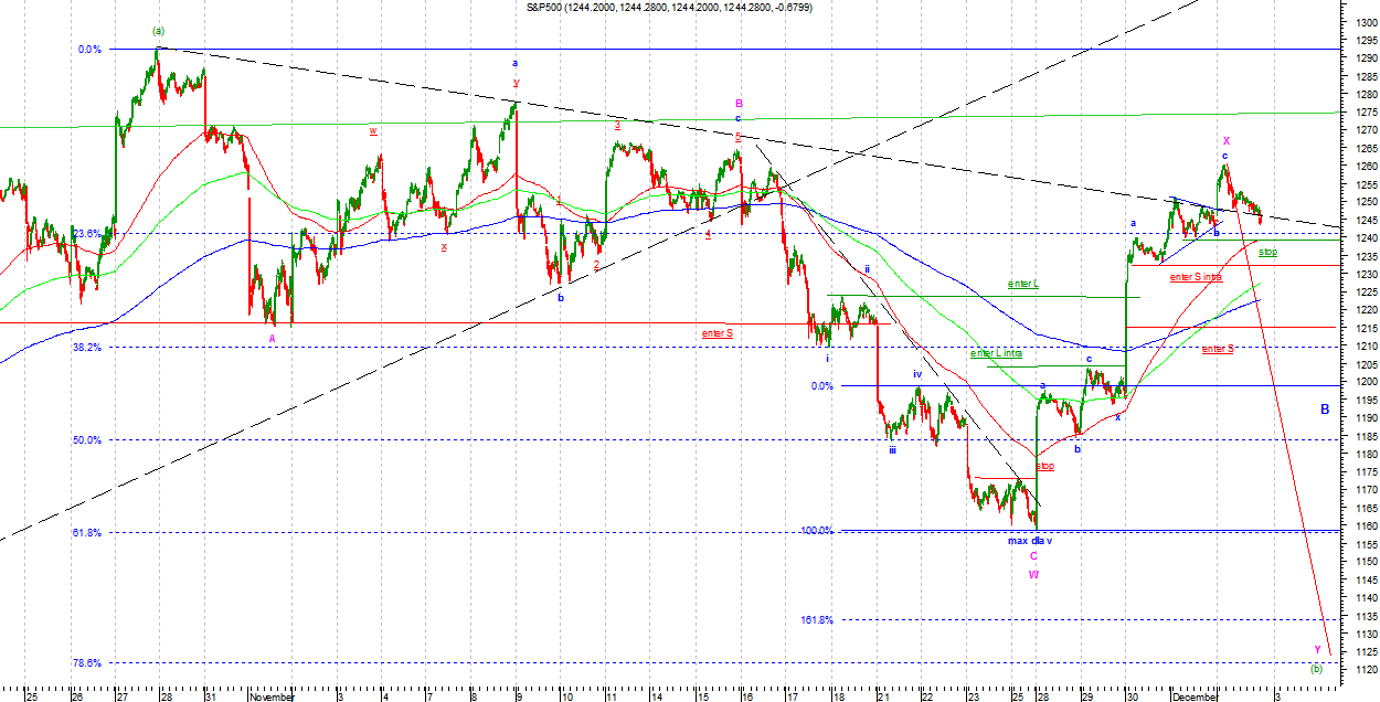 Wersja niedźwiedzia, wg mnie mniej prawdopodobna, zakłada ruch podwójnym Zigzagiem jako fala X Minor. W tym układzie struktura ruchu jest kompletna i każdy wzrost ponad szczyt fali c Minute zaneguje ją. Wstępnym potwierdzeniem zaś będzie impuls spadkowy. Na razie takowego nie widać. Strategia gry zgodnie z v1.