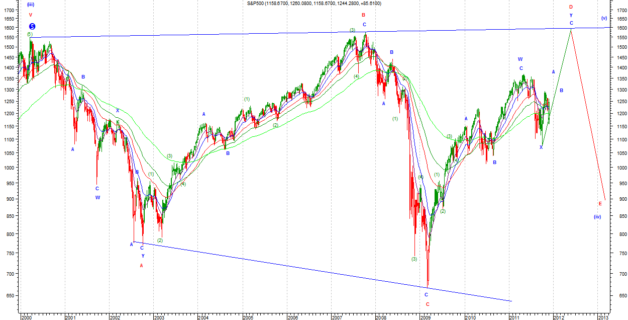 W wersji niedźwiedziej ta sama fala X ma formę TR. Rozpisywanie podfal w tych formacjach jest obarczone największym ryzykiem. Nie mamy wszak pojęcia czy TR będzie zbieżny, rozbieżny, czy prostokątny. Układ, który pokazuje zakłada tę pierwszą formę. W takim układzie kreślona jest podfala c Minute w formie Zigzaga. Do zakończenia podfali a Minuette brakuje więc jednej małej podfali. Po jej wykreśleniu notacja zakłada wykreślenie fali b Minuette oraz kolejnego impulsu wzrostowego jako fala c Minuette. Tu trzeba zaznaczyć, że ewentualny powrót do spadków z obecnego poziomu (bez wykończenia impulsu) może oznaczać, że fala b Minute w TR nie zakończyła się i przybierze złożoną formę wxy Minuette. Jej zasięg to okolice 2200 pkt, a sam TR w takim układzie byłby formą prostokątną z horyzontalną podstawą.