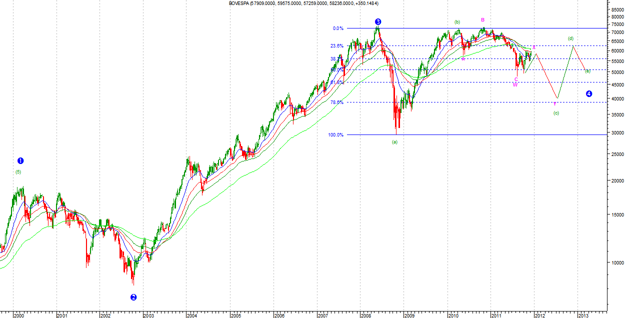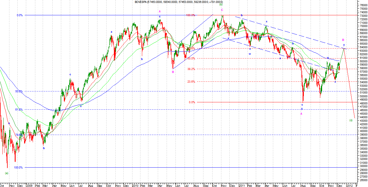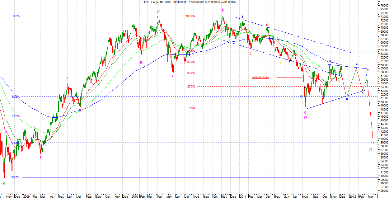 Na BOVESPIE ruch wzrostowy ma per saldo jedenaście podfal. Jest to korekcyjna liczba podfal. Albo więc podfala a Minuette zakończyła się wcześniej i szczyt był podfalą b we Flat, albo ruch był korekcyjny w charakterze. Na razie nie jest to jasne. To co wydaje się czytelne to impuls spadkowy od szczytów. Jeżeli jest to podfala c we Flat to powinna zbliżać się ku końcowi. Kontynuacja impulsowego ruchu w dół oznaczać będzie powrót spadkowego trendu głównego.