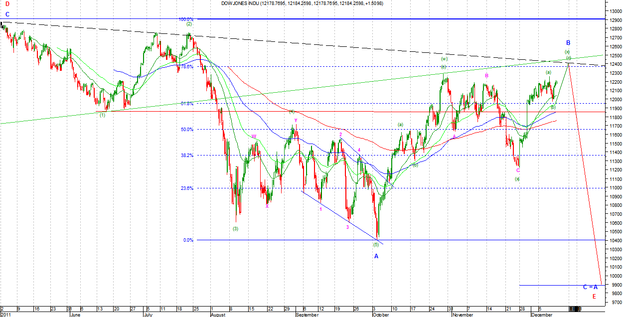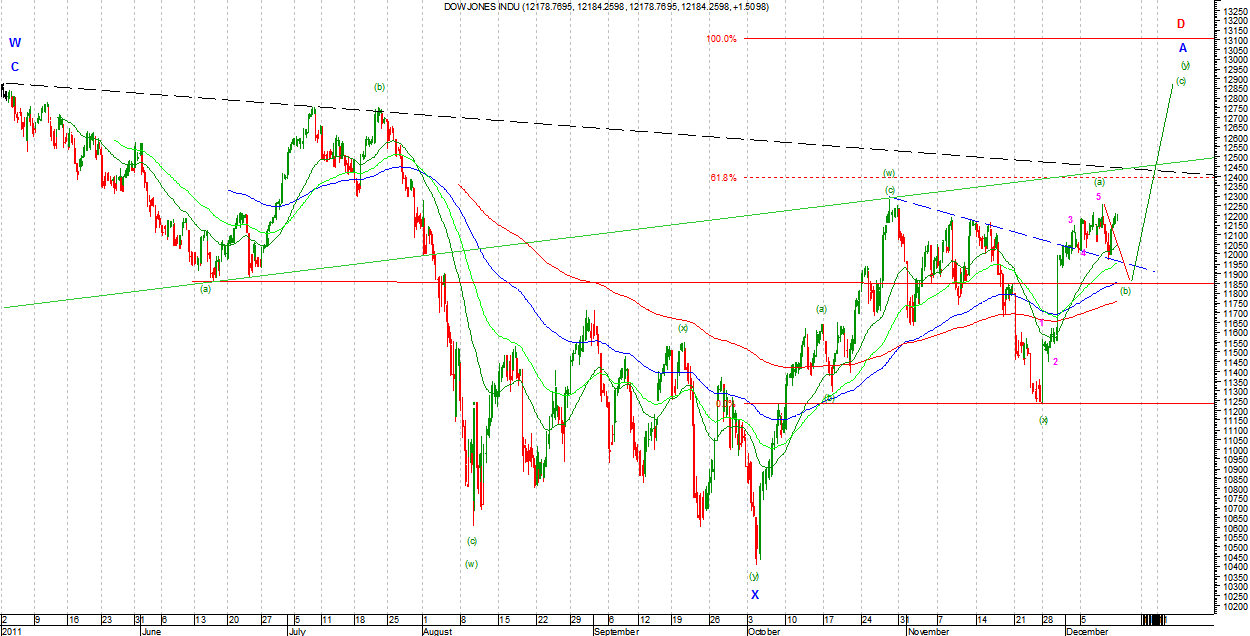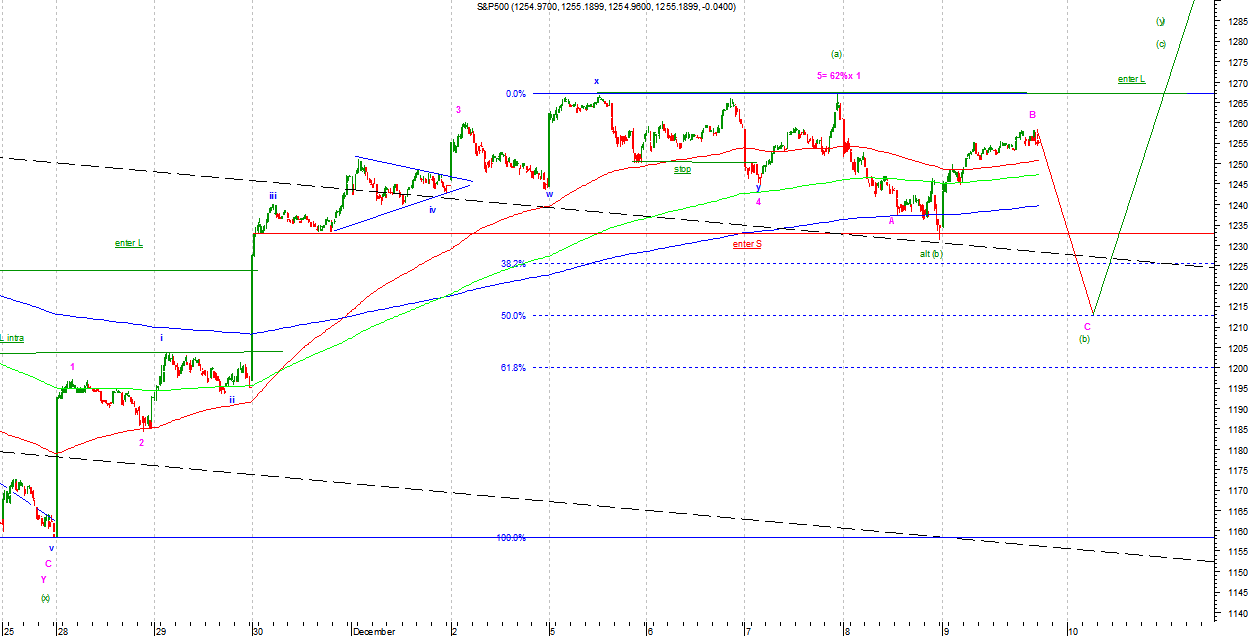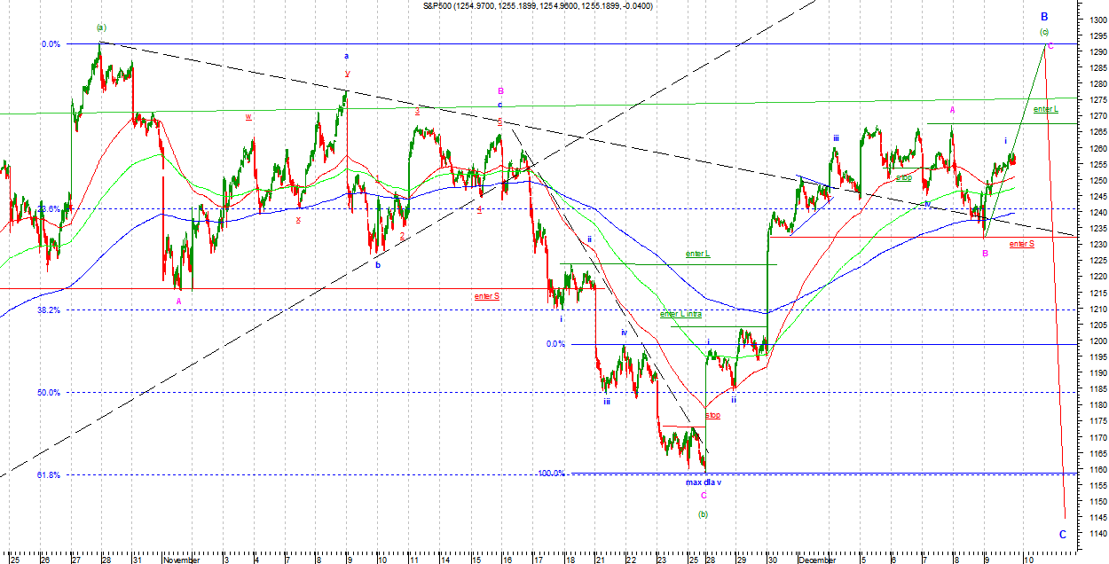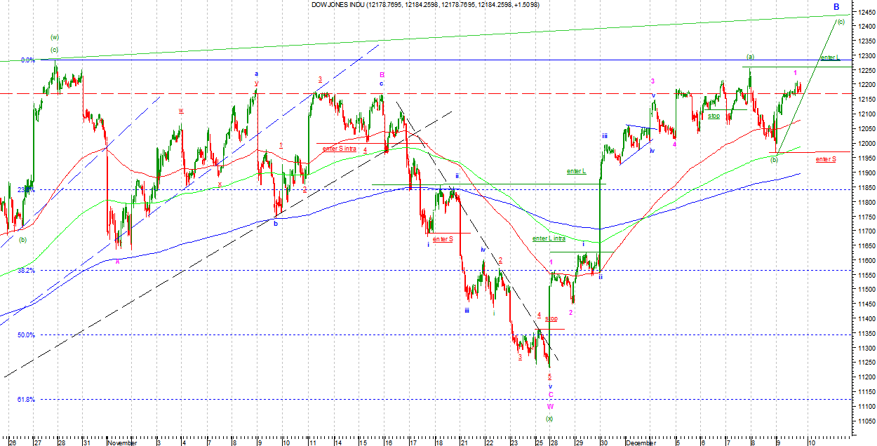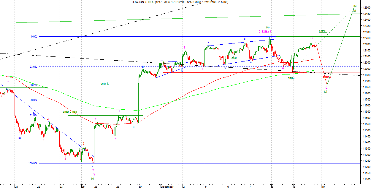Na DJIA i SP500 w wersji byczej kreślona jest podfala (b) Intermediate lub zakończyła się ona na ostatnich minimach. Jeżeli był to koniec to była ona wyjątkowo słaba i świadczy o dużej sile amatorów premii na koniec roku. Ostatnia fala wzrostowa wygląda impulsowo, ale nie mogę wykluczyć, ze jest to c we Flat jako B Minor. W związku z tym nie wykluczam jednak, że fala (b) rozszerzy się nieco w czasie i zasięgu. Strategia gry zgodnie z sygnałem.