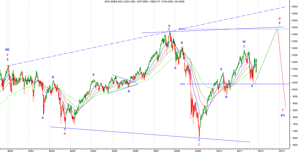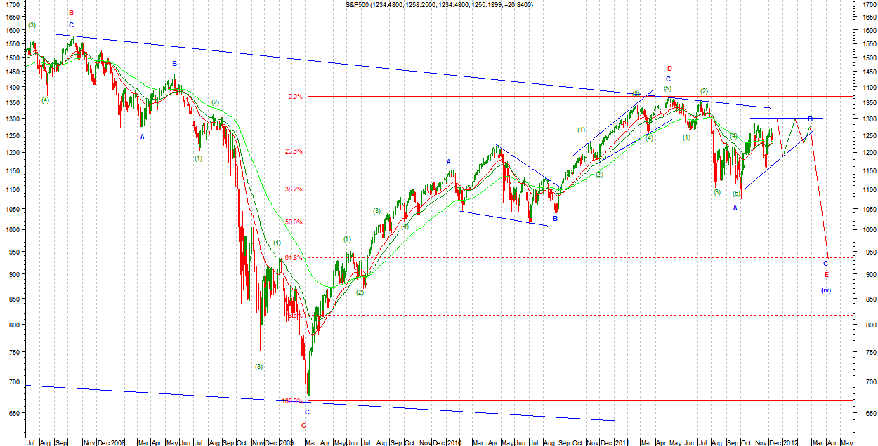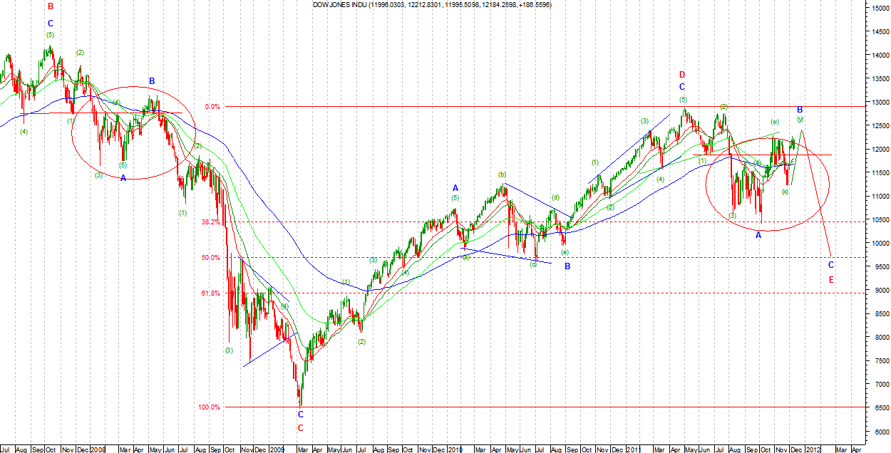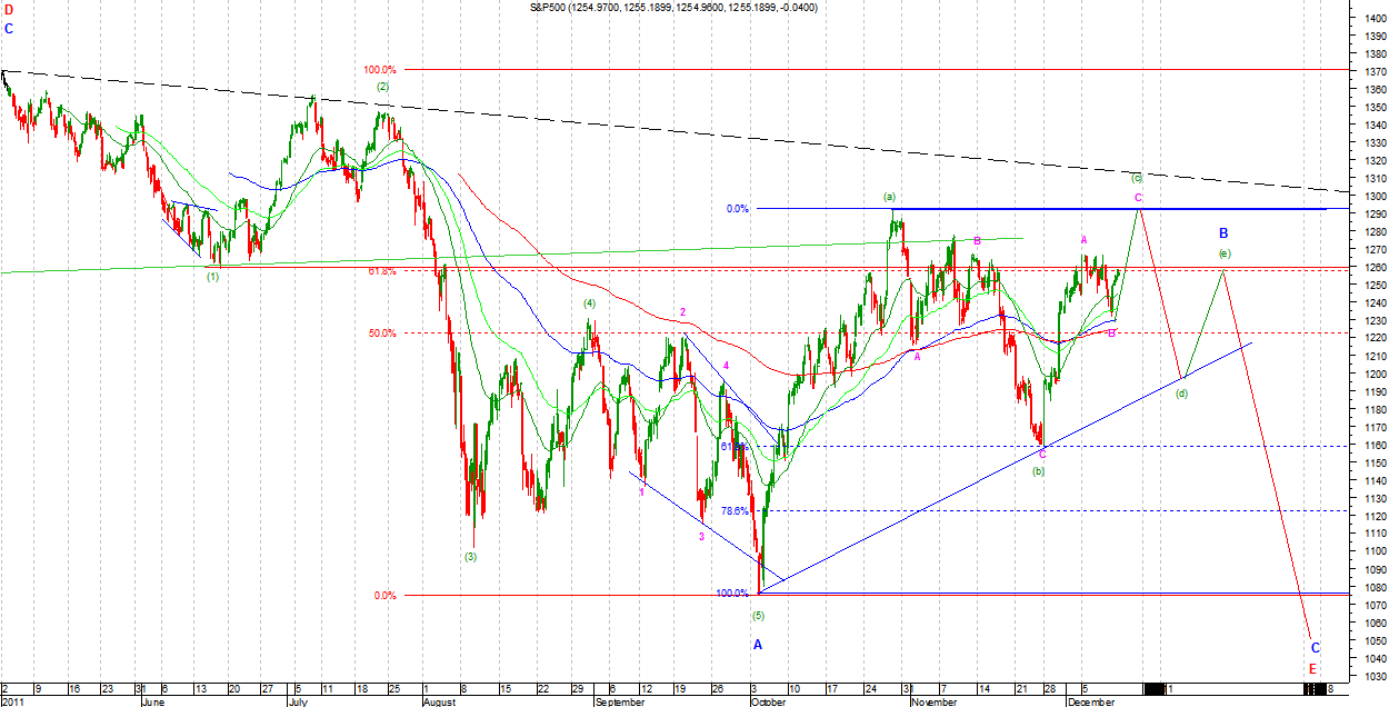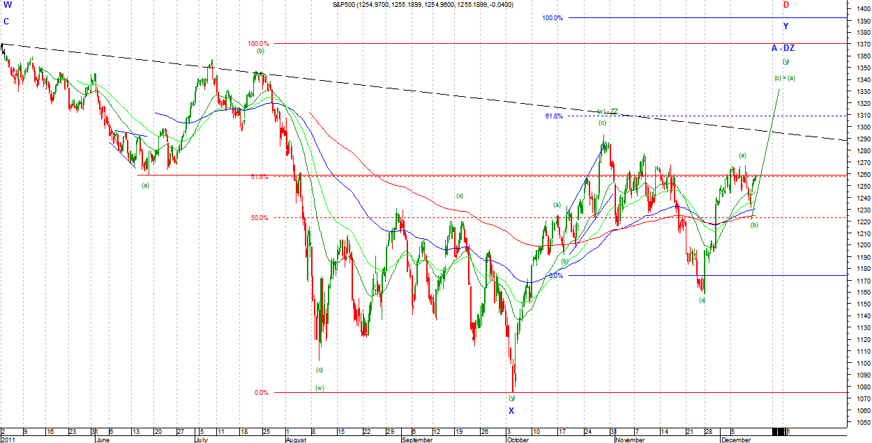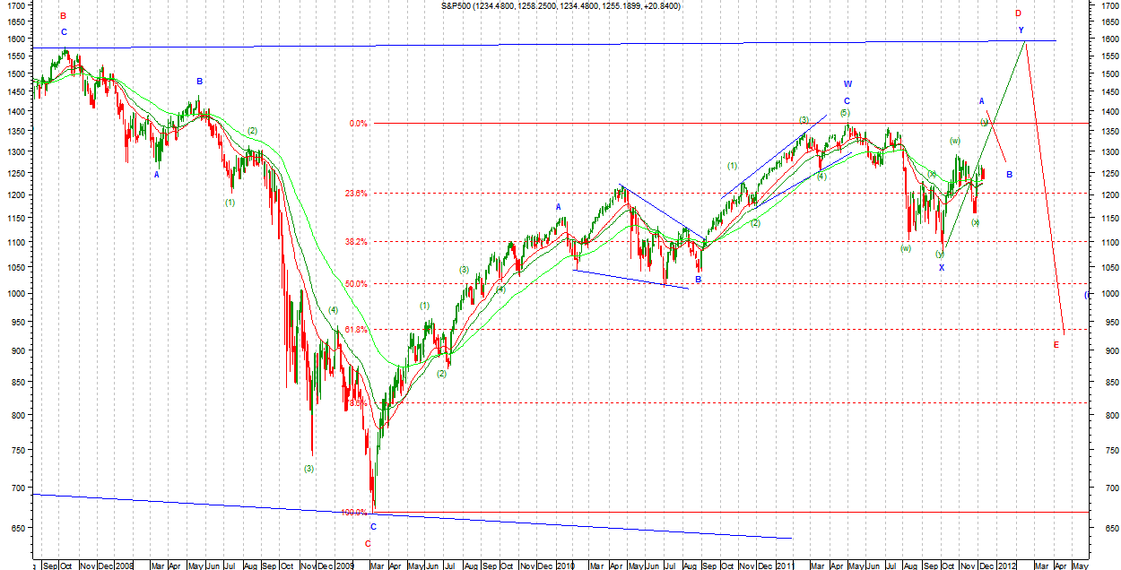 W nowej wersji niedźwiedziej wzrosty są Zigzagiem (a)(b)(c) jako (y) w B Primary. Taki układ możliwy jest na DJIA. Na SP500 nadal możliwe jest kreślenie TR prostokątnego jako B Primary. Układ ten teoretycznie jest możliwy i na DJIA ale fala (c) Intermediate musiałaby być wyjątkowo krótka by nie przekroczyć znacząco szczytu z końca października. Strategia gry zgodnie z v1.