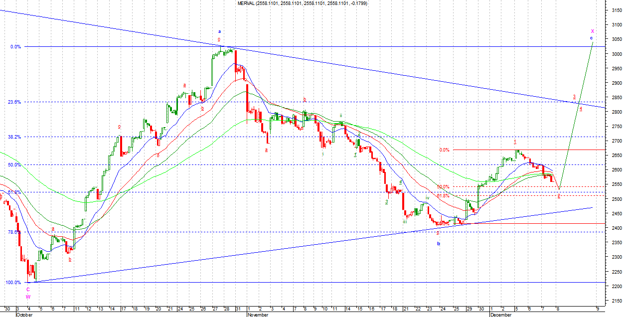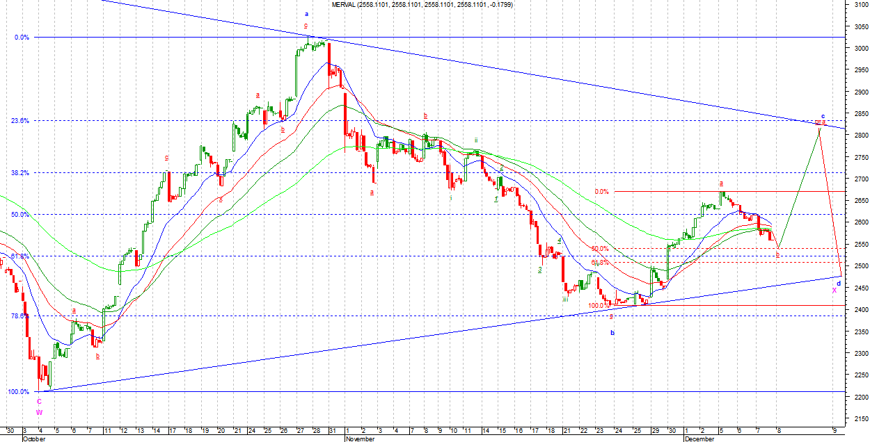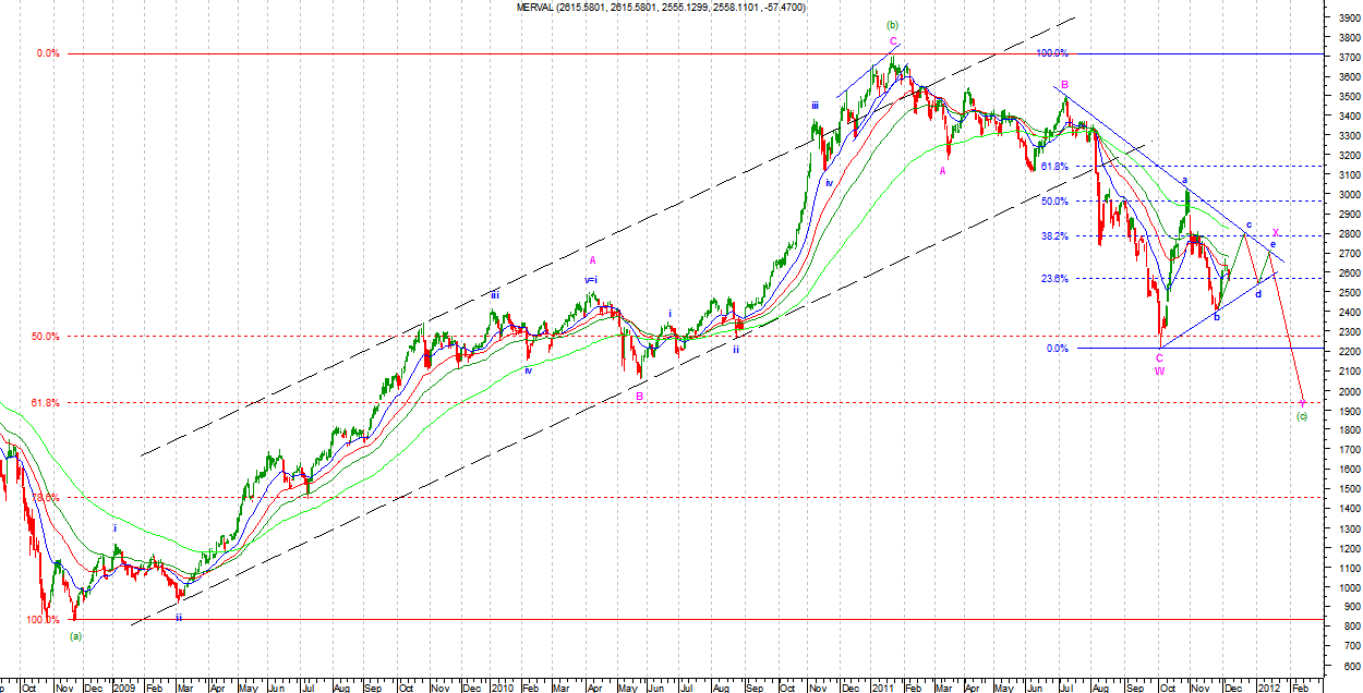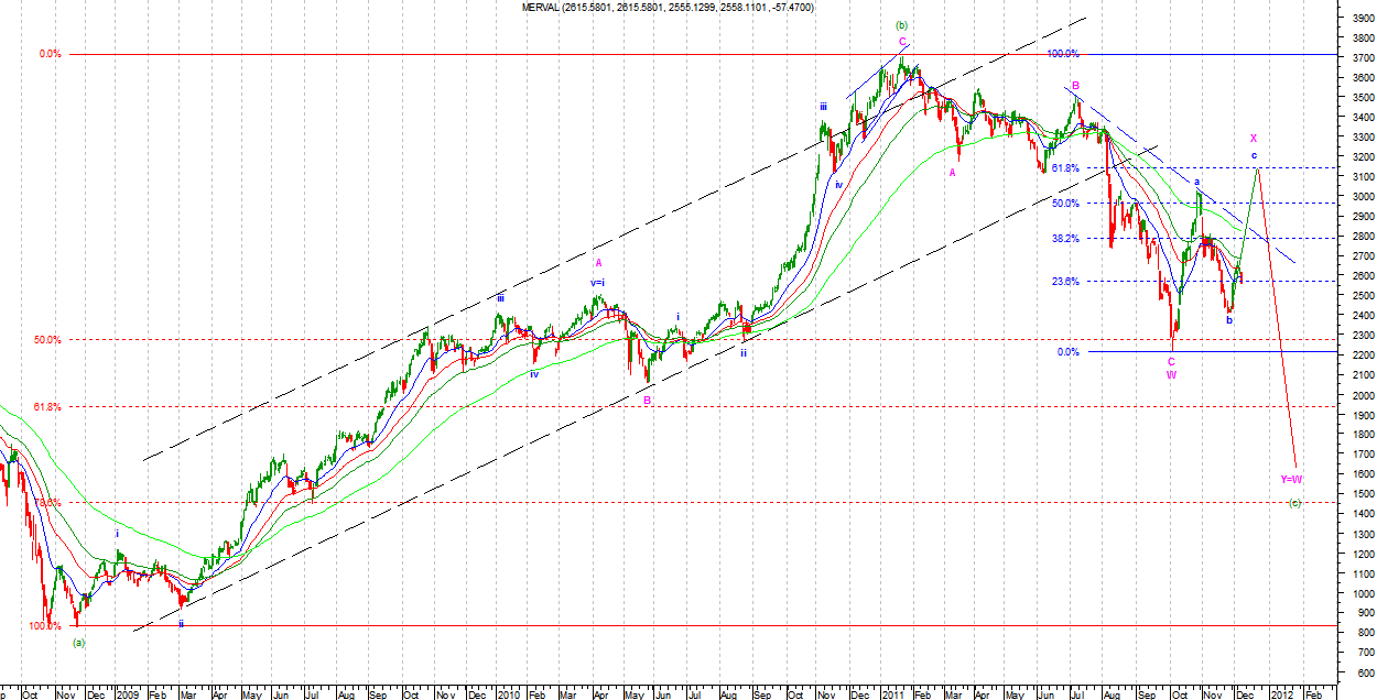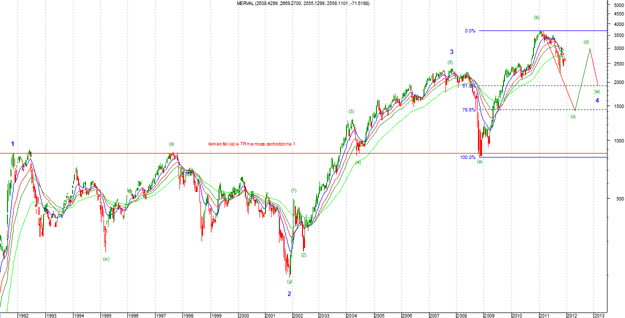 Na MERVALU, o ile liczę poprawnie, ruch wzrostowy ma podfal dziewięć. Jest to impulsowa liczba podfal w strukturze (zakładam, że falka z 24.11 nie należy do impulsu w górę). Do typowego zasięgu dla fali drugiej (50%-62%) jeszcze trochę brakuje. Ruch ten najprawdopodobniej będzie Zigzagiem o strukturze 5-3-5. Jeżeli zrobi się z tego pięciofalowy impuls to zaneguje to obie prezentowane opcje. Taki układ wymagać będzie jednak zejścia poniżej 62% zniesienia fali wzrostowej.