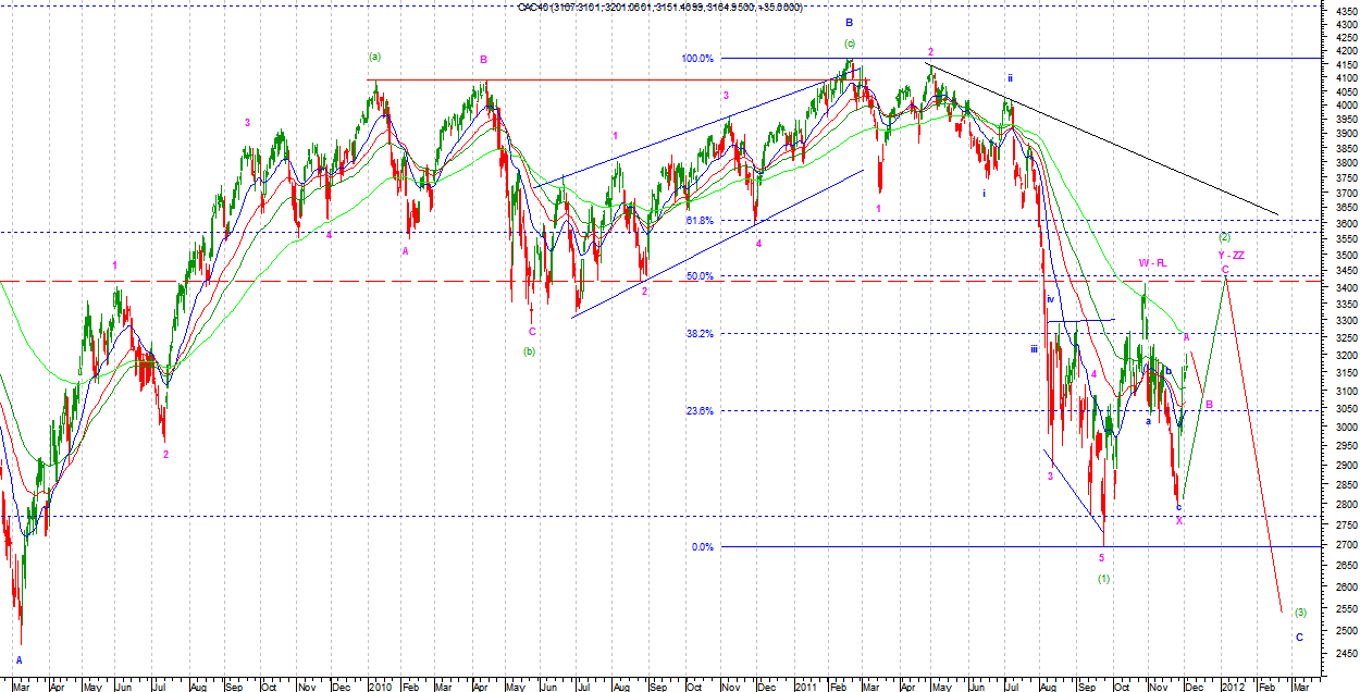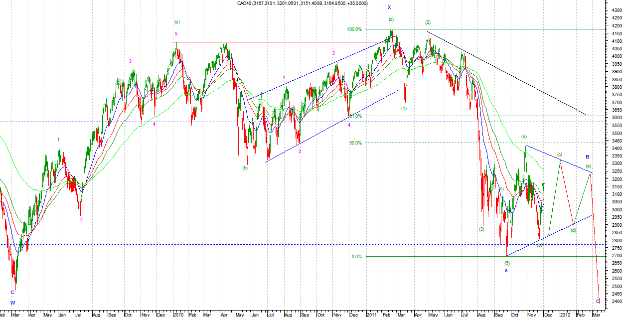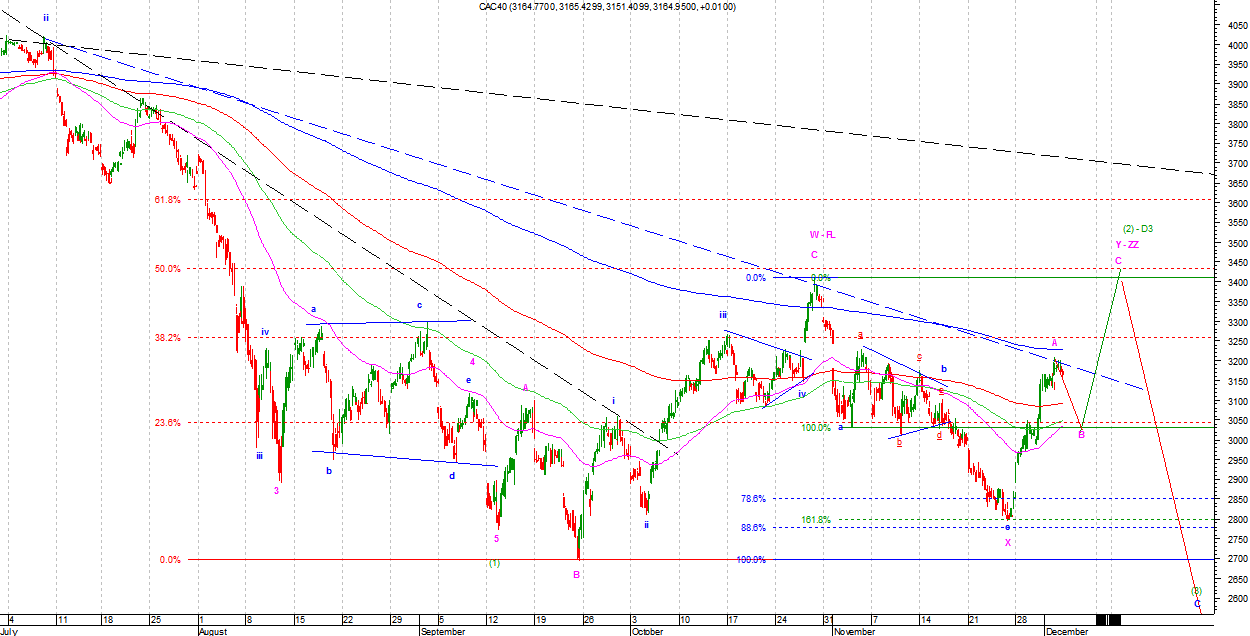 Na CAC40 fale w długim terminie muszą być oznaczone inaczej niż na pozostałych wiodących indeksach. Tu bowiem nie może być mowy o fali IV Cycle w formie trójkąta. Musi ona przybrać inną formę. Stąd trudność z synchronizacją oznaczeń z innymi indeksami.