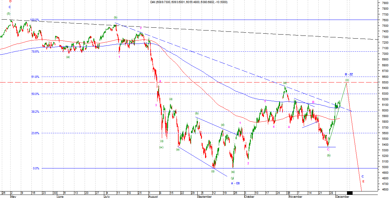 DAX jest w miejscu w którym zdecyduje się krótkoterminowy trend. Mamy bowiem wykreślonego Zigzaga o strukturze 5-3-5. Jeszcze jedna impulsowa fala wzrostowa i zrobi się z tego impuls wzrostowy. To zaneguje hipotezę o fali X. Oczywiście może potem zrobić się z całego ruchu siedem podfal lub jedenaście (układ korekcyjny) ale raczej nie będzie to już fala X w (b) Intermediate. Strategia zgodnie z v2.