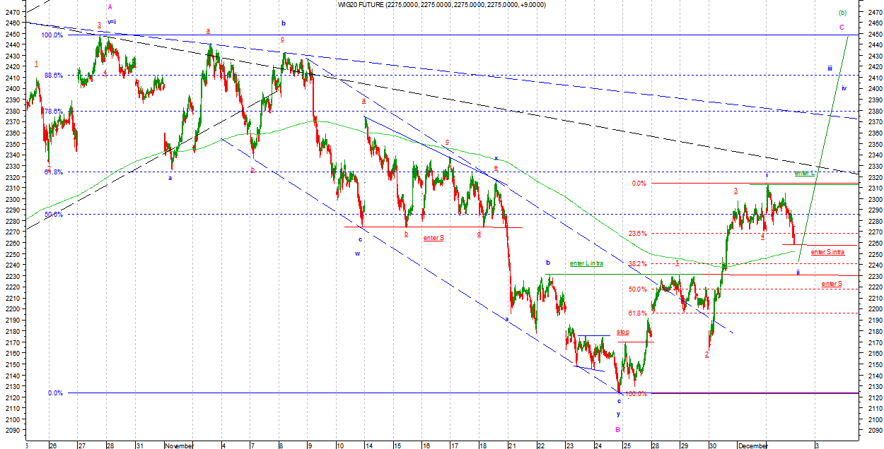 Na FW20 w wersji pierwszej do wstępnego potwierdzenia poprawności notacji brakuje jednej fali wzrostowej, która utworzyłaby impuls jako fala i Minute w C Minor. Jeżeli fala ta nie powstanie, a ewentualny spadek zajdzie na falę 1 Minuette to wersja zostanie zanegowana. Jeżeli jednak zostanie wykreślona ww fala (jutro o 14.40 są dane o zatrudnieniu w USA, które mogą być pozytywne) to sądzę, że ma szanse dotrzeć do spadkowej linii trendu w okolicach 2330 pkt. Z tego poziomu spodziewałbym się odejścia jako fala ii Minute. Strategia gry zgodnie z sygnałem. Wczorajsze L intra były nadzwyczaj smakowite;)