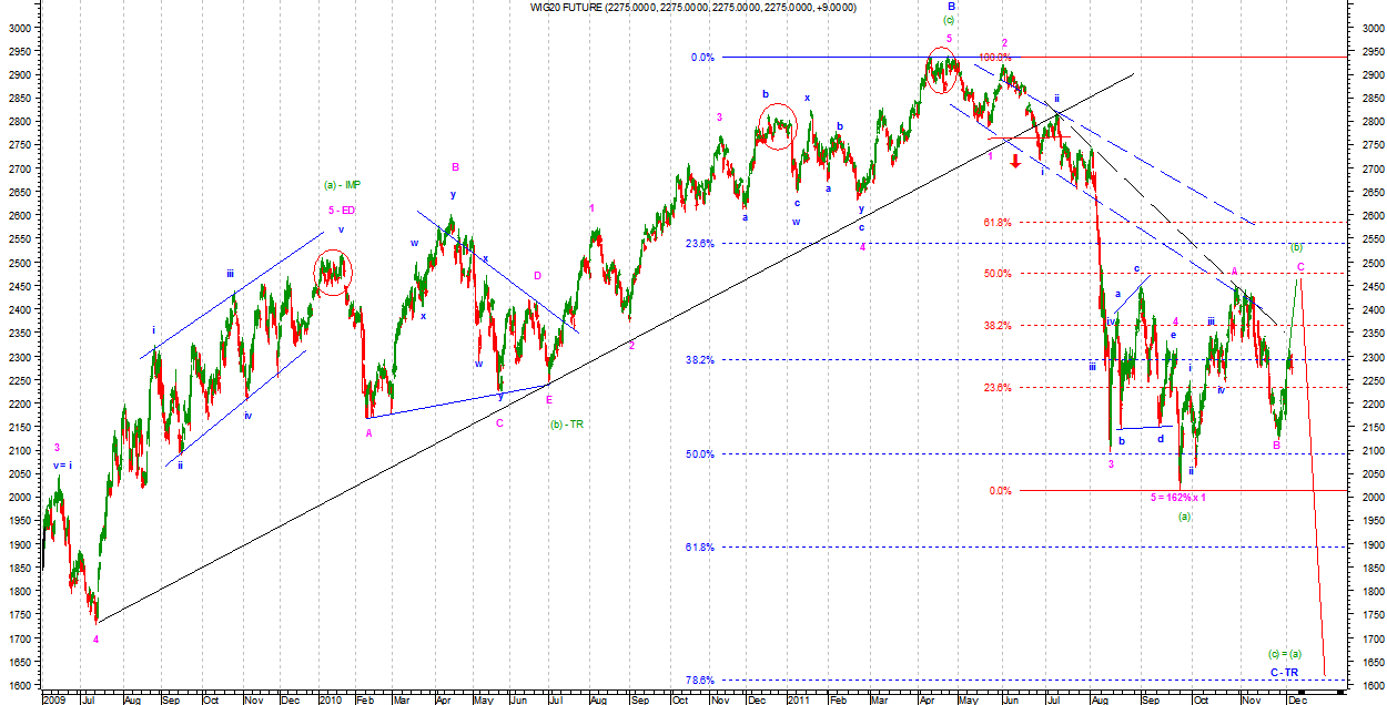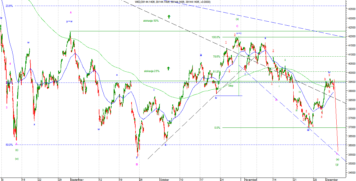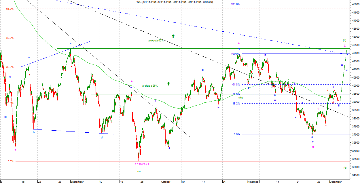 W wersji niedźwiedziej ruch wzrostowy jest podwójnym Zigzagiem. Na korzyść takiej interpretacji przemawia modelowa zmienność podfal w DZ, a więc fala pierwsza w ruchu i ostatnie to fale najkrótsze. Mamy więc zmienność fal krótka, długa – długa, krótka. Tak opisana struktura implikuje rozpoczęcie impulsowych spadków, a każde wyjścia ponad piątkowe maksima notację zaneguje. Samo oznaczenie ostatnich struktur również nie jest przesądzone. Ostatni wzrost może bowiem być podfalą iv Minute w impulsie w dół (wg mnie mniej prawdopodobne bo na innych indeksach taki układ został zanegowany), lub też jest to fala (b) Intermediate w drugiej trójce (y) Intermediate. Strategia gry zgodnie z v1.