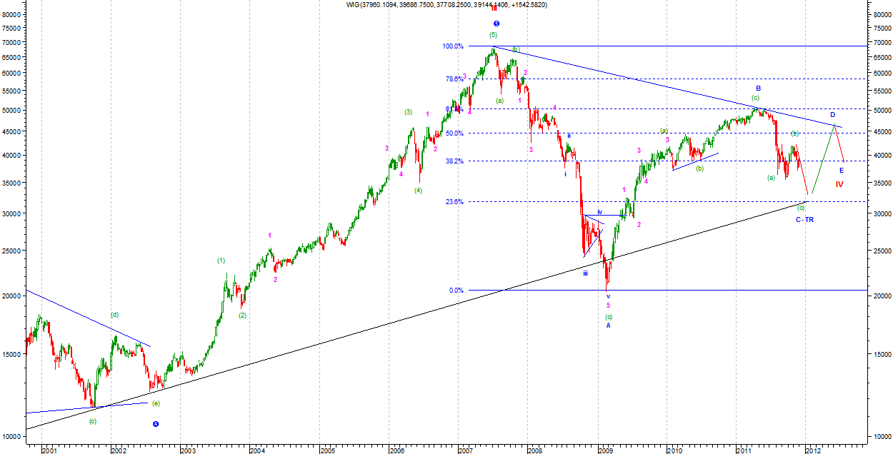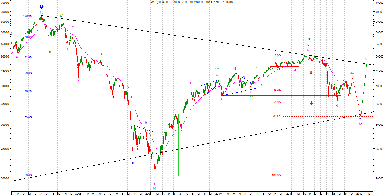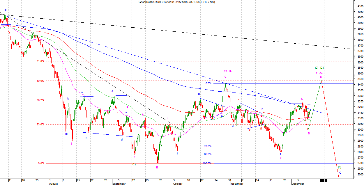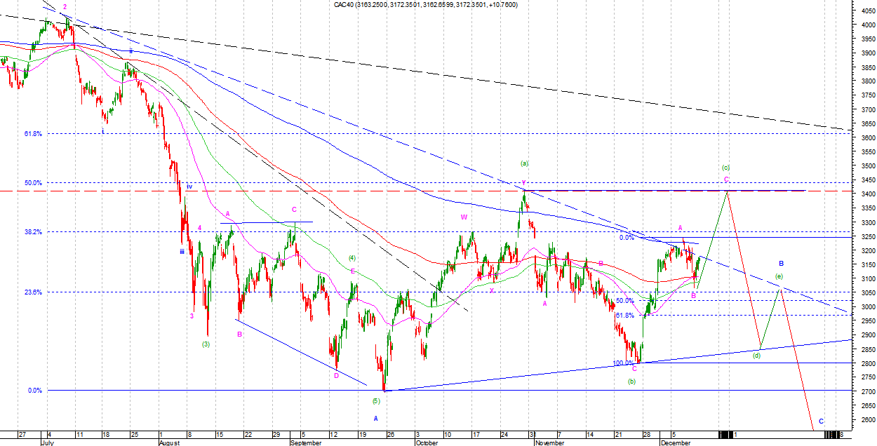 Dla CAC40 być może rozpoczęła się podfala C Minor. Wymaga to jednak potwierdzenia kontynuacją ruchu wzrostowego powyżej szczytu fali A Minor. Gdyby tak się nie stało to hipoteza o zakończeniu fali B Minor upadnie. Fala ta ma miejsce na ewentualne spadki do okolic 3000 pkt. Niższe zejście zaneguje notację.