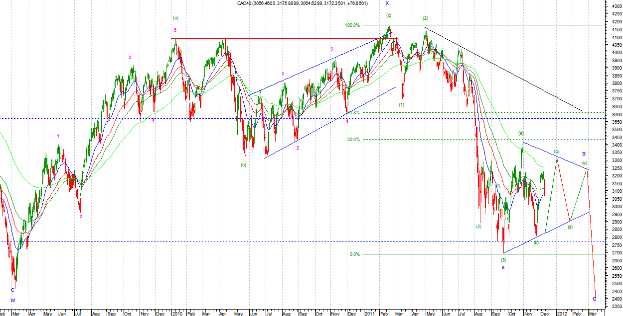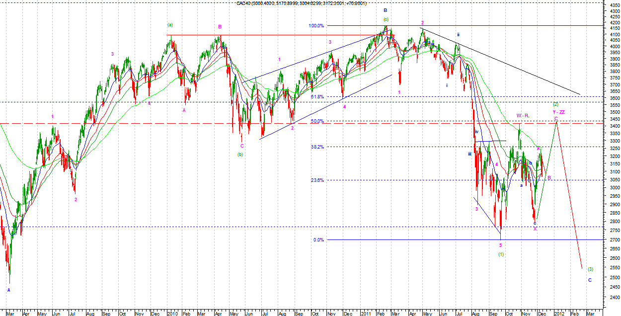 Na CAC40 w wersji pierwszej kreśli podfalę A Minor w formie impulsu. Czy ją zakończył? Na razie chyba nie. Ktoś pytał o ED na tym indeksie. Jest on możliwy ale w postaci Expanding Diagonal. W takim wypadku max dla fali v Minute to 3235 pkt gdyż fala trzecia w ED nie może być najkrótsza. Wyższe wyjście zaneguje ED.