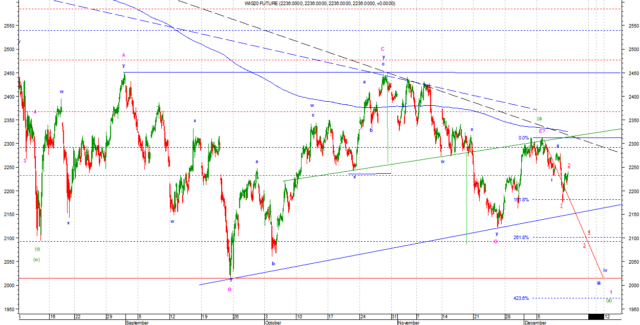 Na FW20 zakończenie struktury abc Minuette skutkowało dość znaczącym podejściem. Podejściem, które w razie kontynuacji mogło uchodzić za impuls wzrostowy. Nic z tych rzeczy. Późniejsze ruchy zweryfikowały sentyment obrońców linii trendu. Jest to podręcznikowy przykład powstawania fal silnych fal x w złożonych strukturach. Gdy okazało się, że byki są w błędzie w panice się tratowały. Wg oznaczeń jest to podfala y Minuette. Jej równość z falą w Minuette wybada dokładnie na 62% zniesieniu fali wzrostowej (2195 pkt). Jest to poziom, do którego sensowne jest rozpatrywanie tego oznaczenia jako poprawne. Zamknięcie znacząco poniżej będzie dawało tylko teoretyczne szanse na kontynuację ruchu w górę (poniżej 10%). Strategia gry to pozycja krótka po 2260 pkt (przetrzymana krótka intra) ze stopem na 2215 pkt.