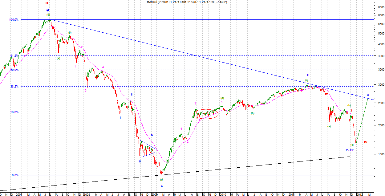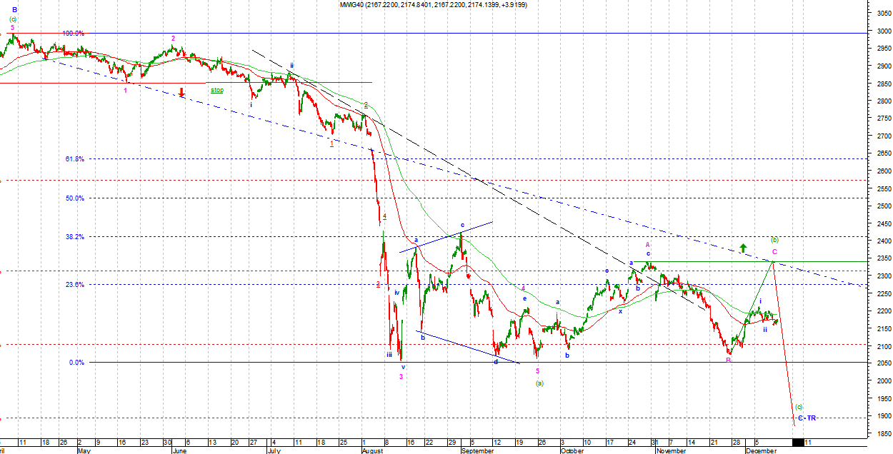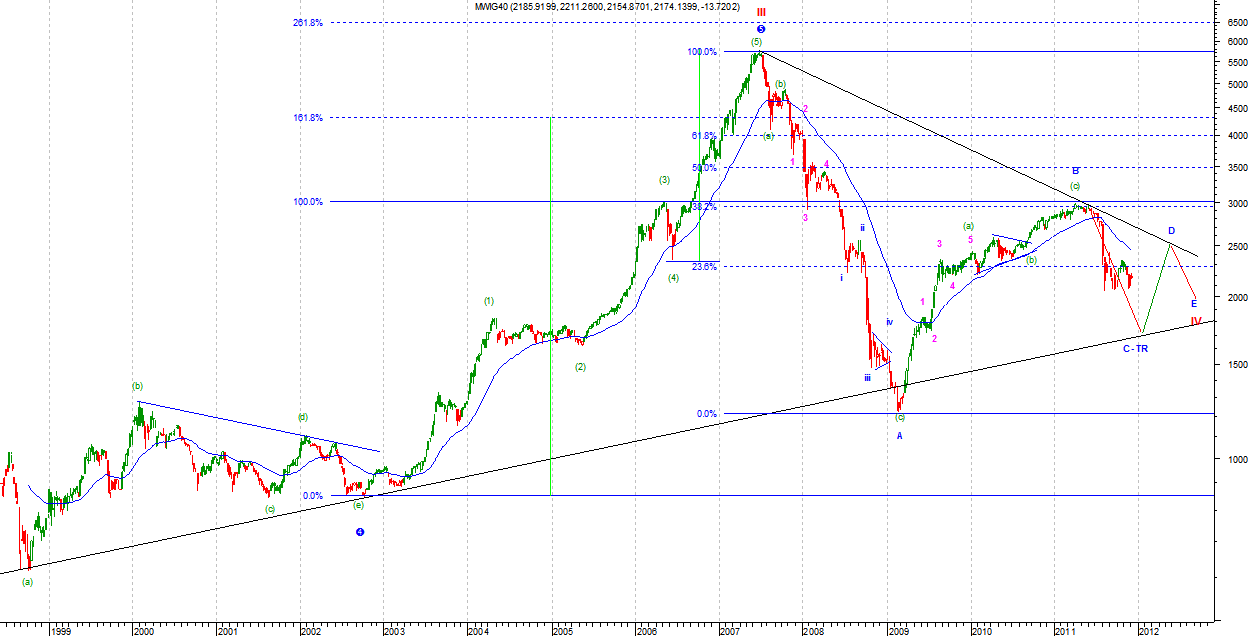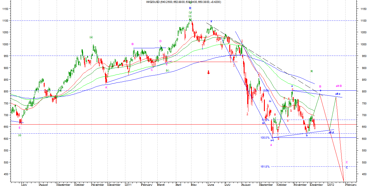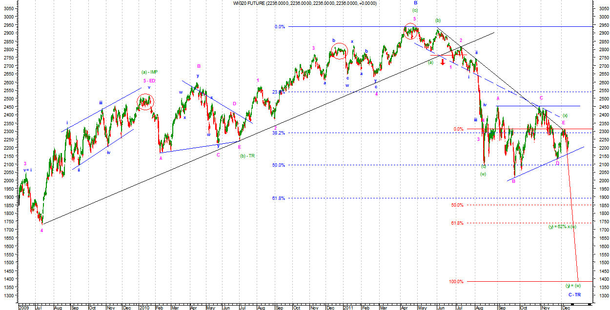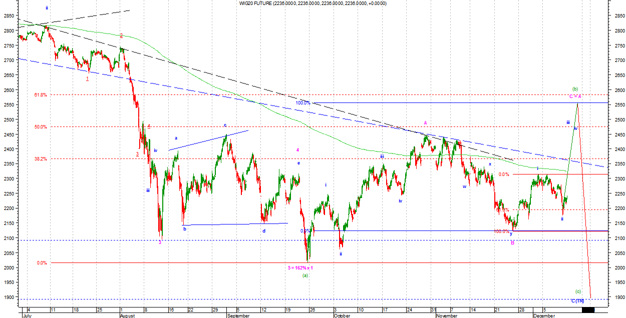 W wersji niedźwiedziej kreślona jest podfala 3 Minuette. Jej zasięg wynikający z ekspancji Fibo 162% fali pierwszej wypada w okolicach 2150 pkt. Tak głębokie zejście oczywiście zdejmie ze stołu wersję bycza oznaczeń i potwierdzi notację niedźwiedzią. Cały impuls powinien zakończyć się w okolicach 2110-2120 pkt. Ruch, który nastąpi potem zadecyduje czy spadki były falą v Minute w 1 Minor, czy impulsem wyższego stopnia w fali (c) Intermediate. Fala alt(c) Intermediate ma zasięg nieco większy, bo równość z falą alt (a) Intermediate wypada w okolicach 2000 pkt.