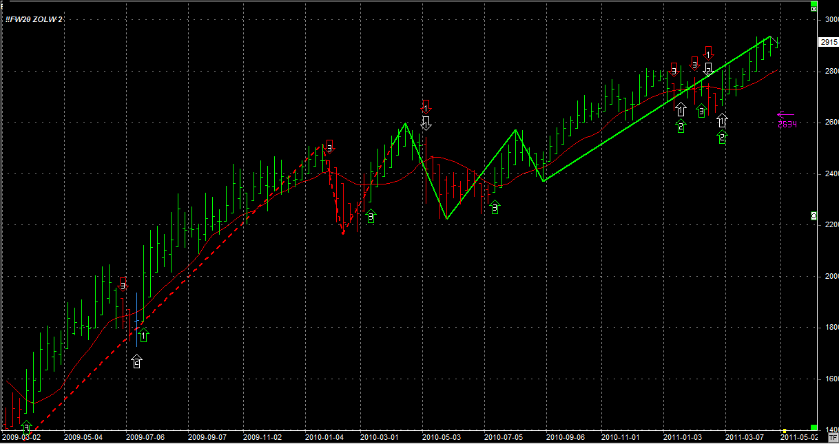 Na Żółwiu sytuacja bez zmian. System ignoruje obecną konsolidację. Tydzień zamknął się na poziomie 2915pkt, 4 punkty wyżej niż w zeszłym tygodniu. Poza tym nic nowego. System nadal utrzymuje 2 długie kupione po 2789 pkt.