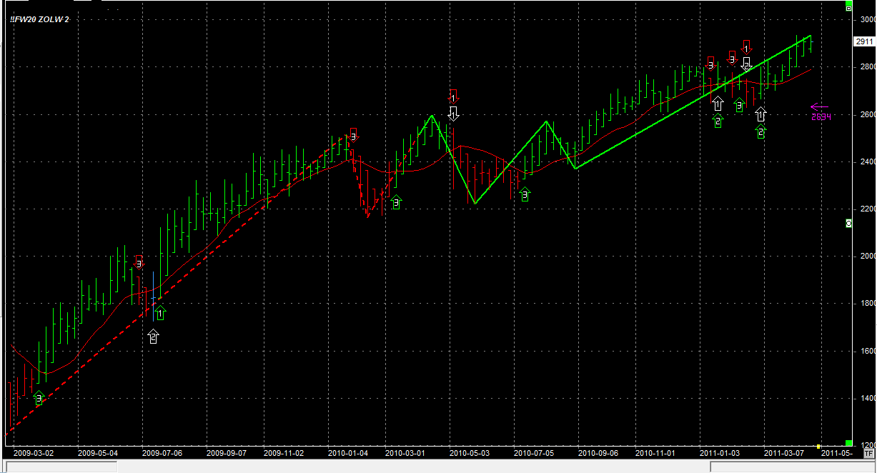Na Żółwiu sytuacja bez zmian. Tydzień zamknął się na poziomie 2911pkt, 14 punktów niżej niż w zeszłym tygodniu. Poza tym nic nowego. System nadal utrzymuje 2 długie kupione po 2789 pkt.